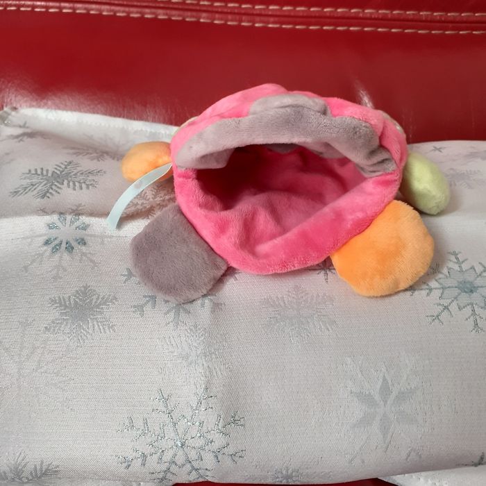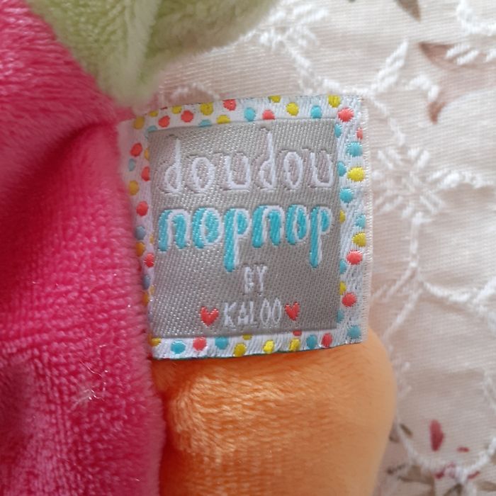 Doudou-Marionnette marque Kaloo, modèle Nopnop. Tête et pattes rembourrées; yeux brodés; multicoloris et multi-textures ( tissu velouté, polyester, feutrine, ruban ) Intérieur en tissu velouté // voir photos pour détails