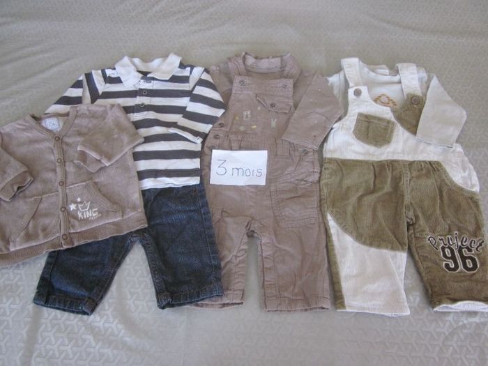 3m, 2 salopettes + jean + polo ml + 2 hauts ml + veste velours, kitchoun, l'enfant do, grain de blé, p'tit bisou