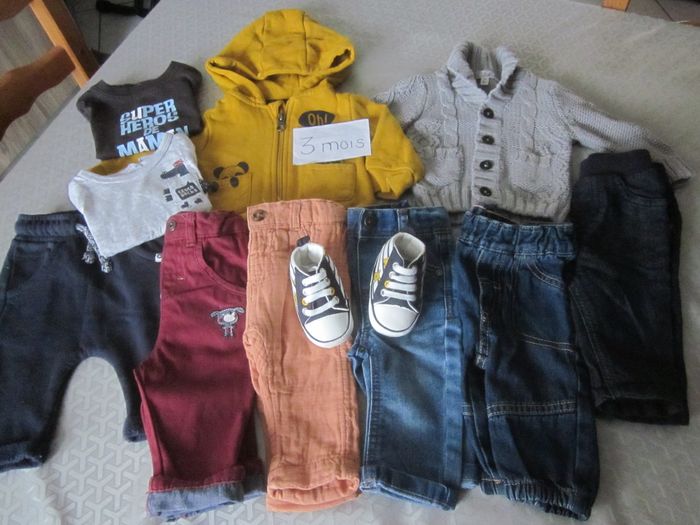 3m, veste à capuche + gilet + 6 pantalons + 2 haut + paire de chaussures (neuves), kitchoun, kimbaloo, kiabi, tao, orchestra, mes p'tits cailloux