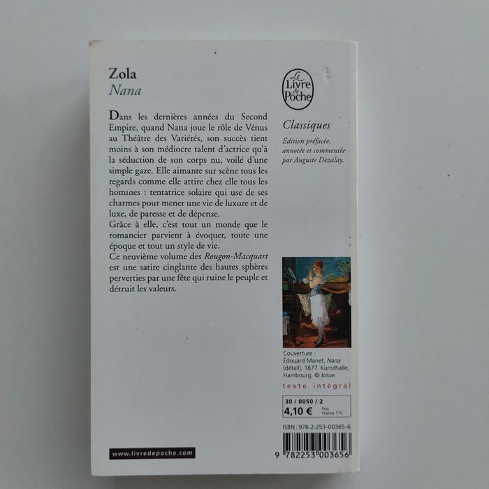 Dans les dernières années du Second Empire, quand Nana joue le rôle de Vénus au Théâtre des Variétés, son succès tient moins à son médiocre talent d'actrice qu'à la séduction de son corps nu, voilé d'une simple gaze. Elle aimante sur scène tous les regards comme elle attire chez elle tous les homines:tentatrice solaire qui use de ses charmes pour mener une vie de luxure et de luxe, de paresse et de dépense. Grâce à elle, cest tout un monde que le romancier parvient à évoquer, toute une époque et tout un style de vie. Ce neuvième volume des Rougon-Macquart est une sSatire cinglante des hautes sphères perverties par une fete qui ruine le peuple et détruit les valeurs.