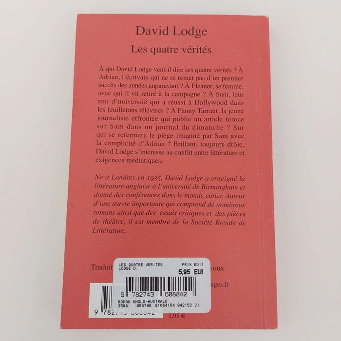 À qui David Lodge veut-il dire ses quatre vérités ? A Adrian, l'écrivain qui ne se remet pas d'un premier succès des années auparavant ? A Eleanor, sa femme. avec qui il vit retiré à la campagne:? A Sam, leur ami d'université qui a réussi à Hollywood dans les feuilletons télévisés ? A Fanny Tarrant, la jeune journaliste effrontée qui publie un article féroce sur Sam dans un journal du dimanche ? Sur qui se refermera le piège imaginé par Sam avec la complicité d' Adrian ? Brillant, toujours drôle, David Lodge s' intéresse au conflit entre littérature et exigences médiatiques Né à Londres en 1935, David Lodge a enseigné la littérature anglaise à l'université de Birmingham et donné des conférences dans le monde entier. Auteur 'une œuvre importante qui comprend de nombreux ainsi que des essais critiques et des pièces romans de théâtre, il est membre de la Société Royale de Littérature.