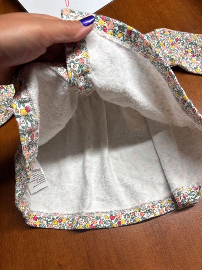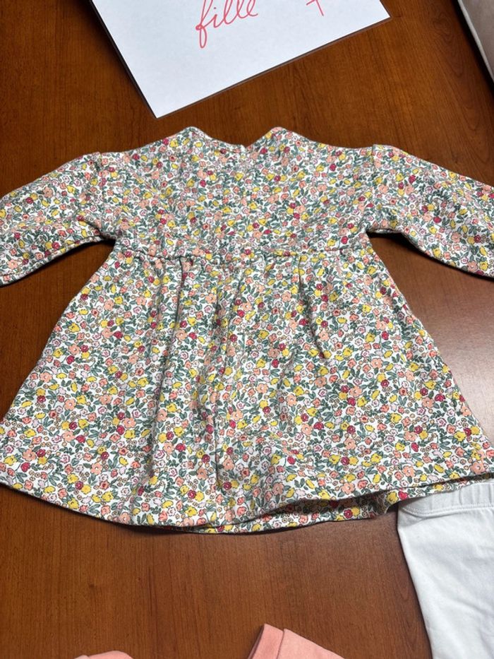 Ensemble composé d’une robe épaisse à fleurs liberty manches longues Un legging blanc et un gilet corail #marieclaire2712mois 🚭maison non fumeur et sans animaux 🤑remises activées sur les lots