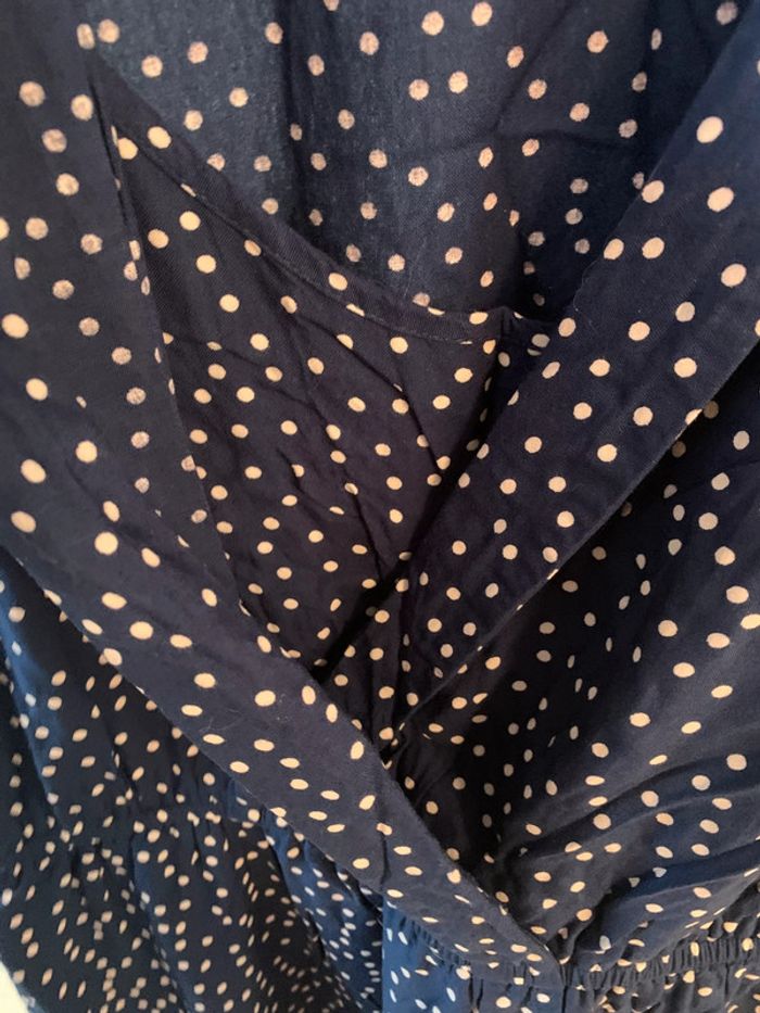 Robe en viscose en très bon état taille 40 Jupe forme portefeuille Taille élastique Doublée Bleue marine à pois blanc 45 cm de aisselles à aisselles 40 cm épaules 85 cm longueurs