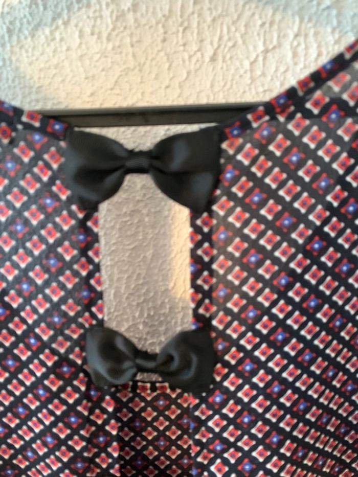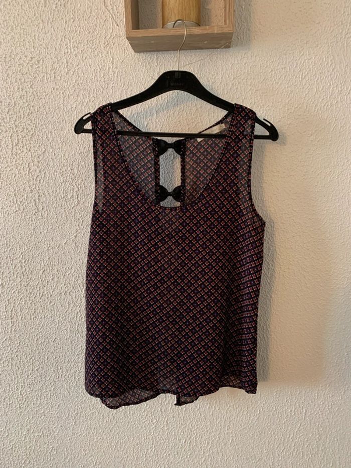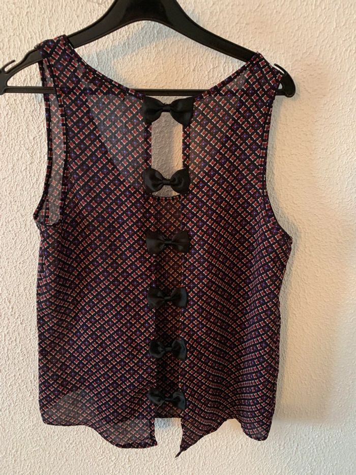 Haut été avec dos ajouré avec des petits noeuds noirs En très bon etat Taille S/M soit 36/38 Matière fluide Largeur aisselles à aisselle 44 cm Longueur total au plus long 65 cm Couleur fond noir à bec petits motos blanc bleu rouge Façon débardeur