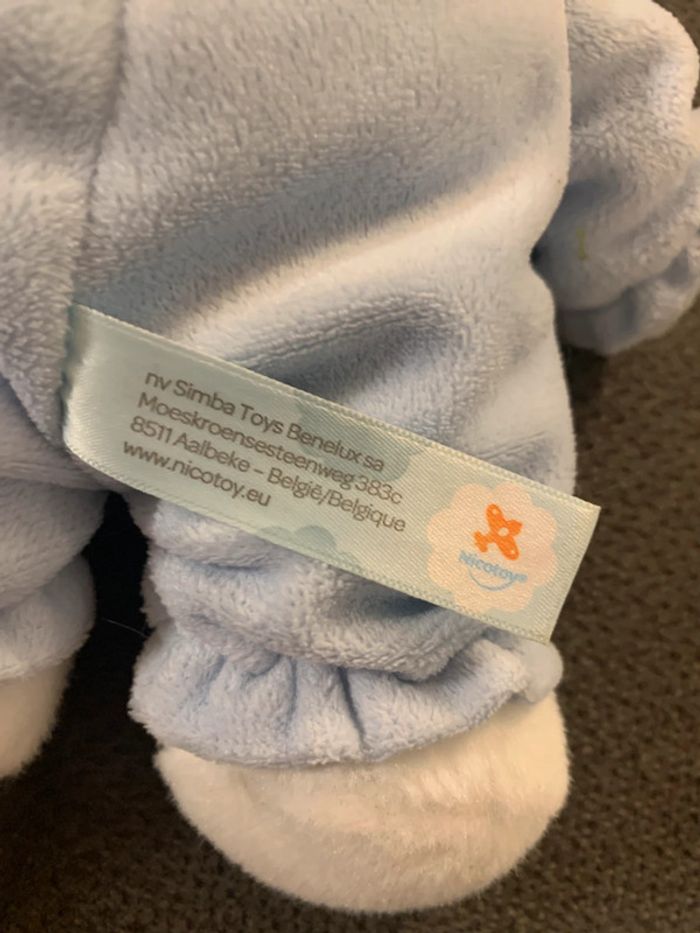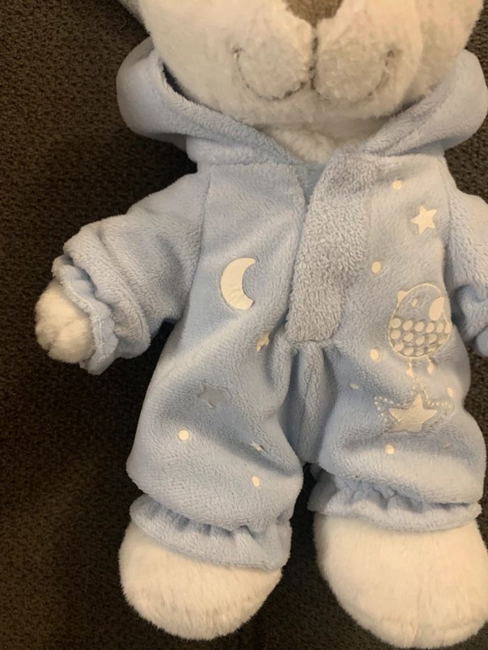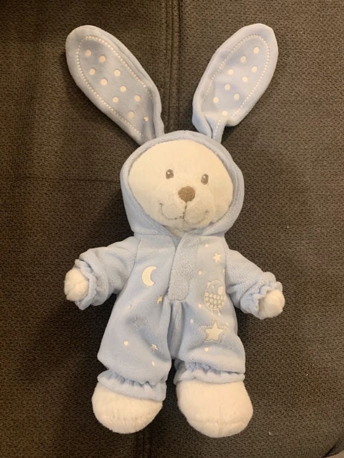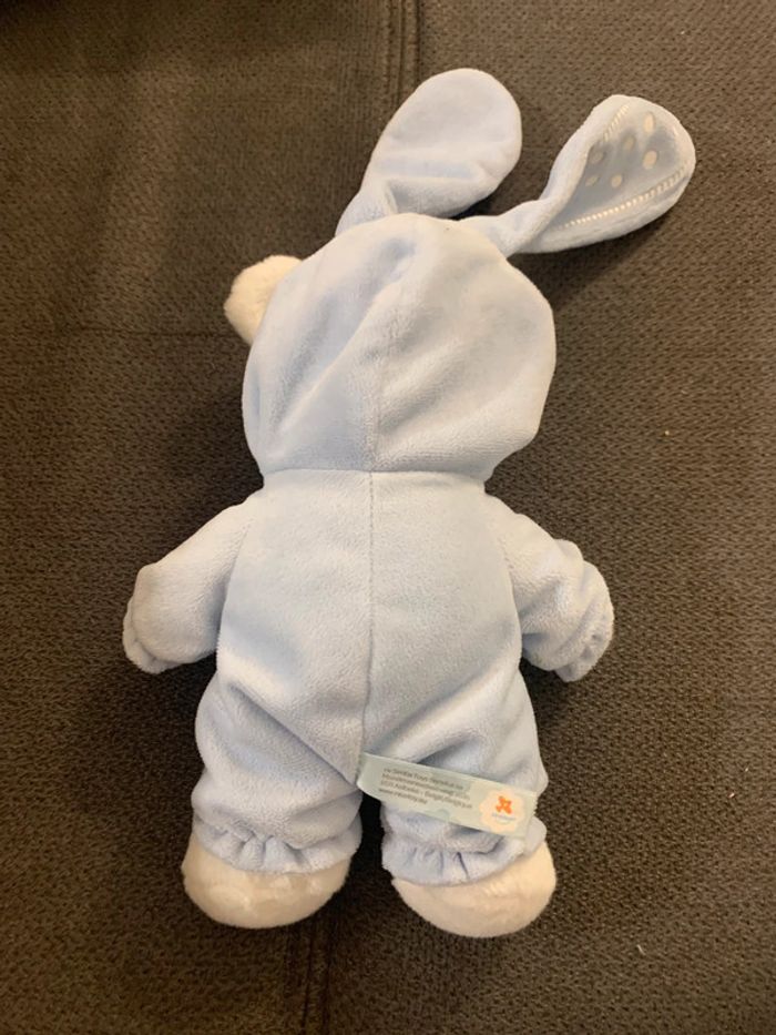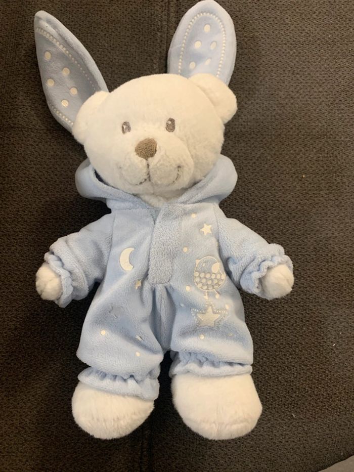 En très bon etat Ourson blanc en peluche avec déguisement de lapin bleu clair en. Velours avec. Des étoiles 28 cm sans les oreilles