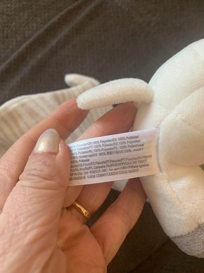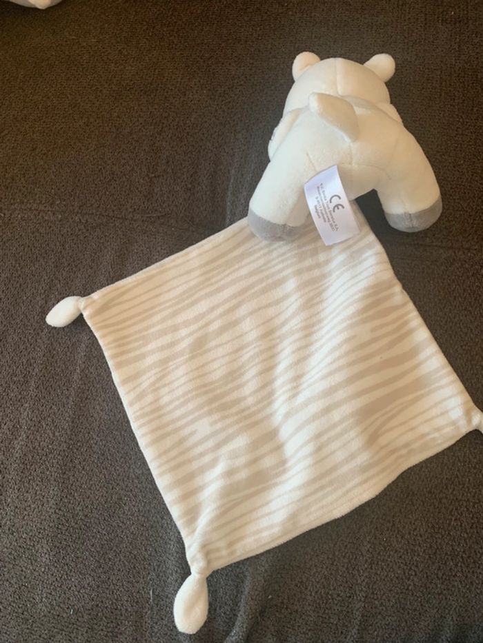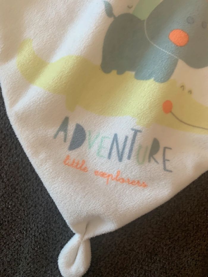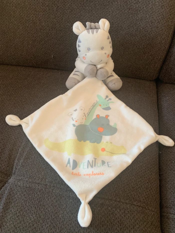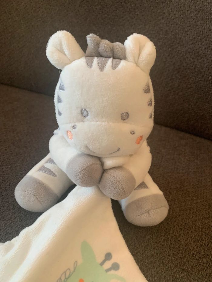 Doudou en très bon état Petit zèbre qui tient un carré 20 x 20 cm Hauteur zèbre 14 cm Marque Simba toys Kiabi Matière velours