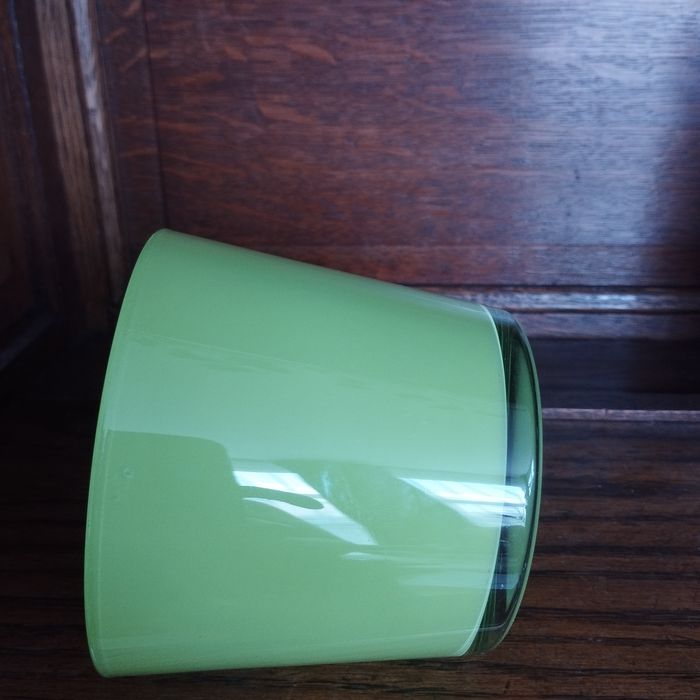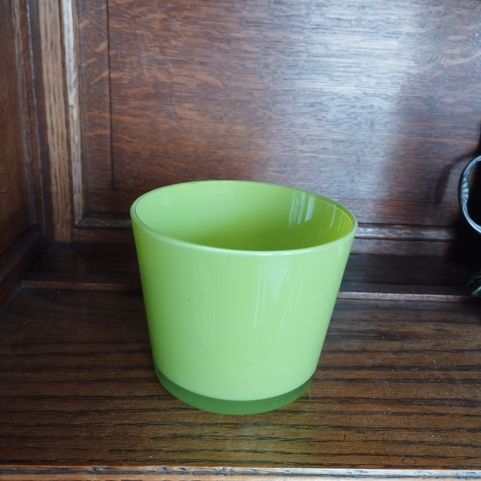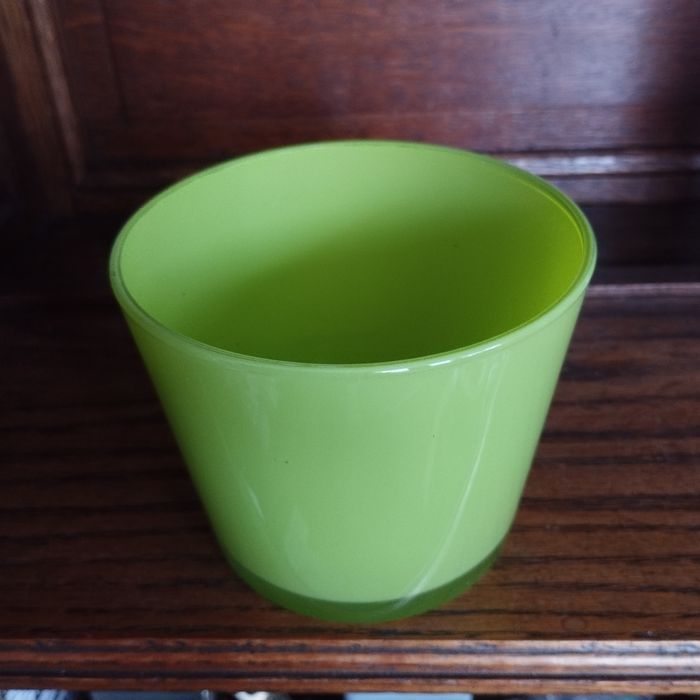 Pot, vase en verre pour décoration, coloris vert anis, fond épais. Diamètre 11cm. Hauteur 9cm.