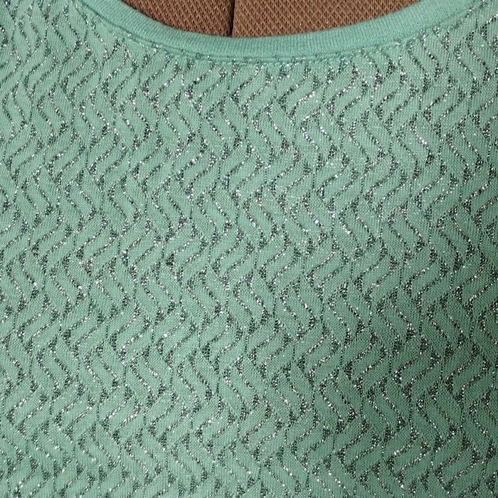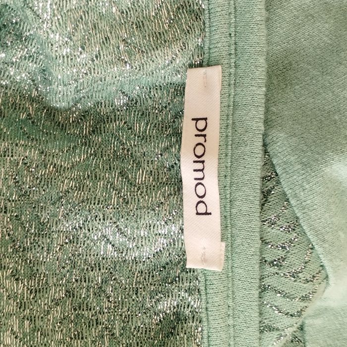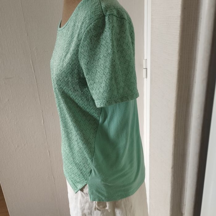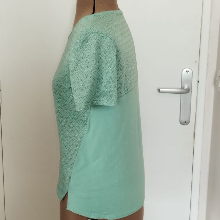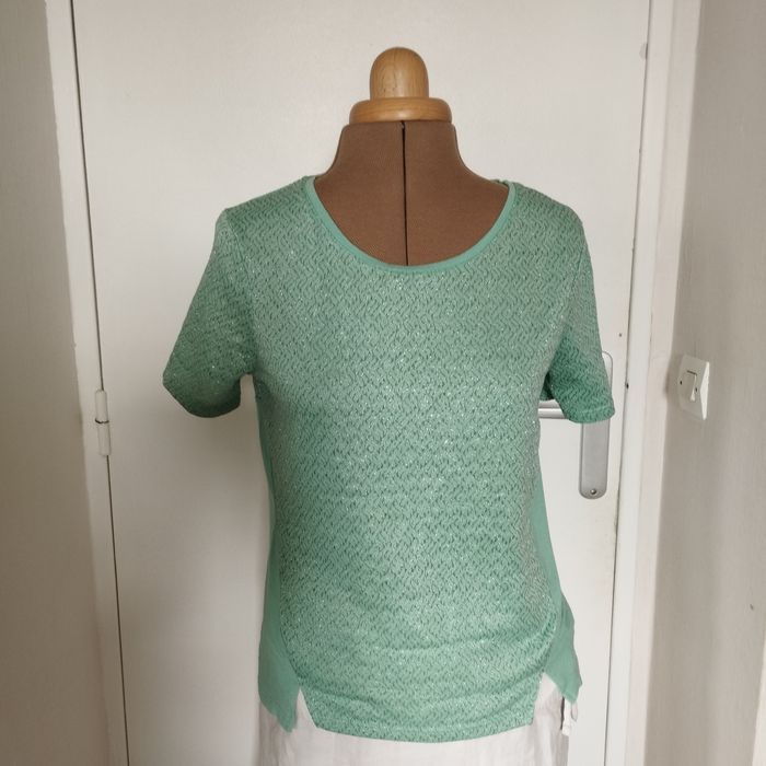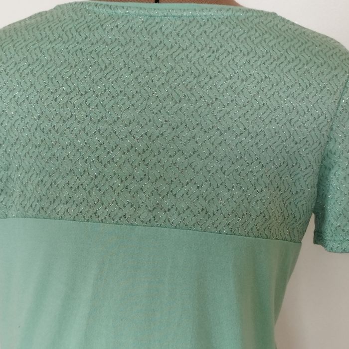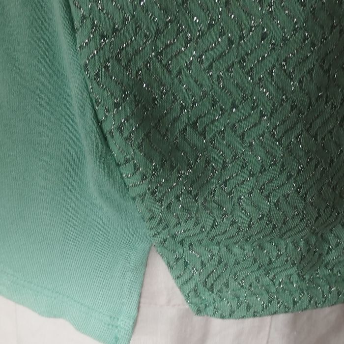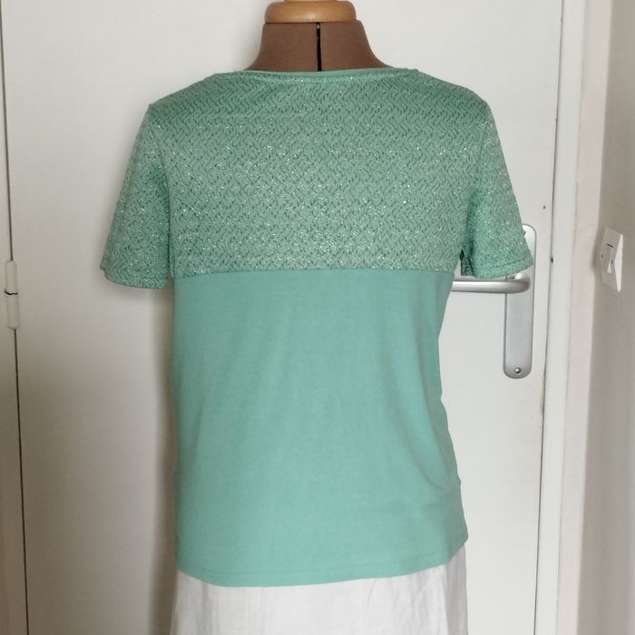 Haut à petites manches pour femme taille 38 de chez Promod, coloris vert avec partie fibre métallique argentée. Aisselle à Aisselle 45cm. Hauteur 55cm.