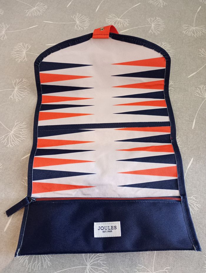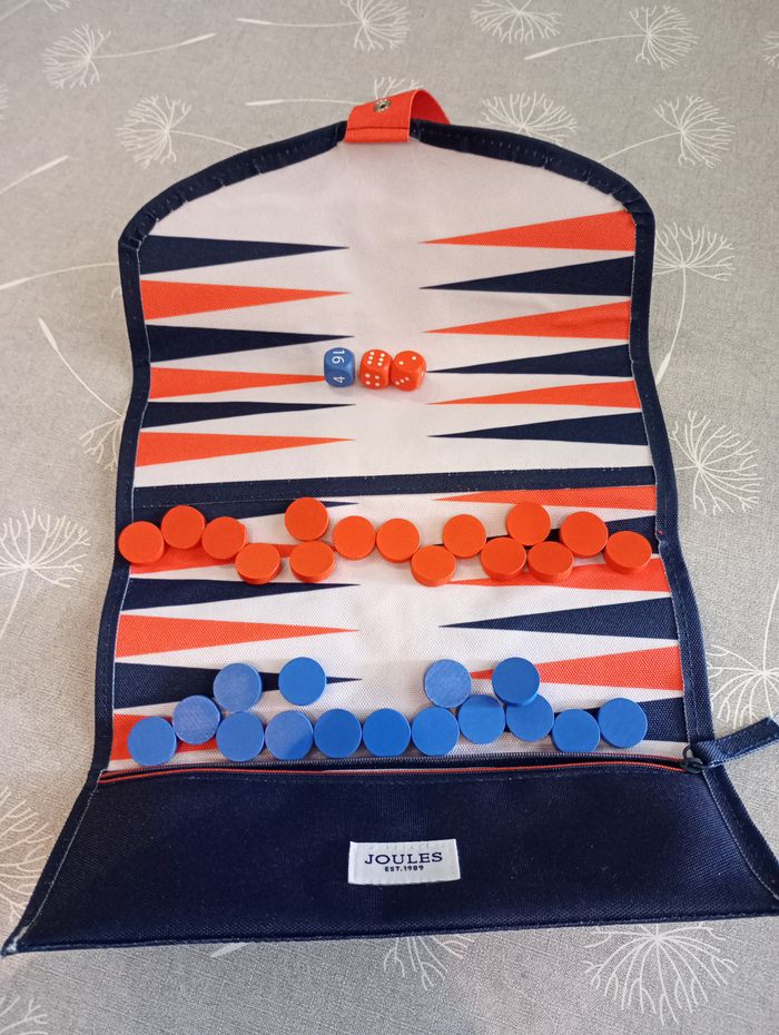 Jeu de Backgammon de voyage. Trousse solide avec 30 jetons (15 bleus et 15 rouges) et dés. Marque : Joules. Neuf.