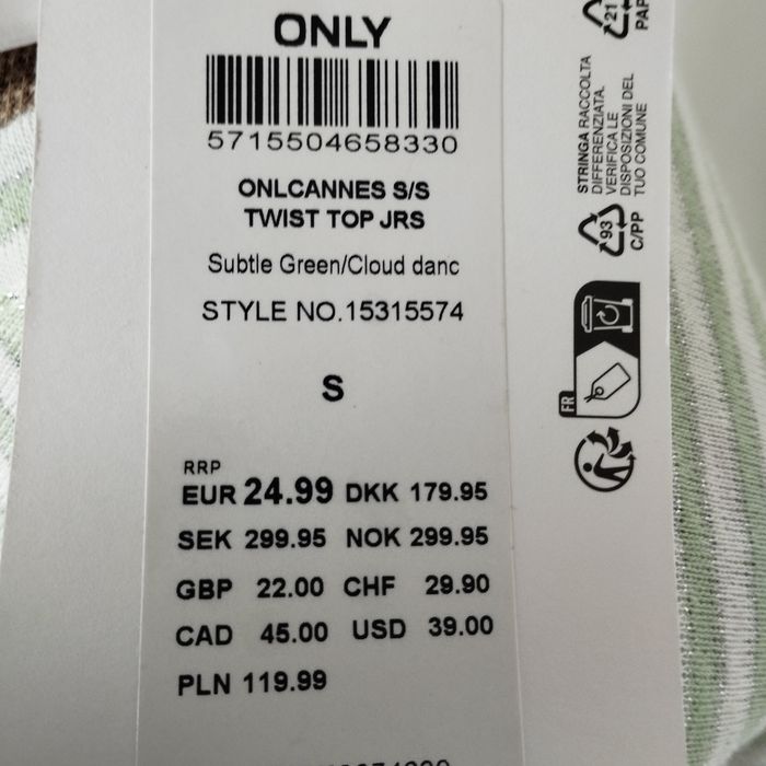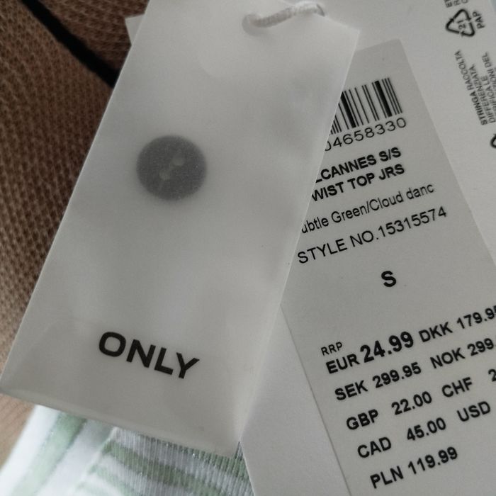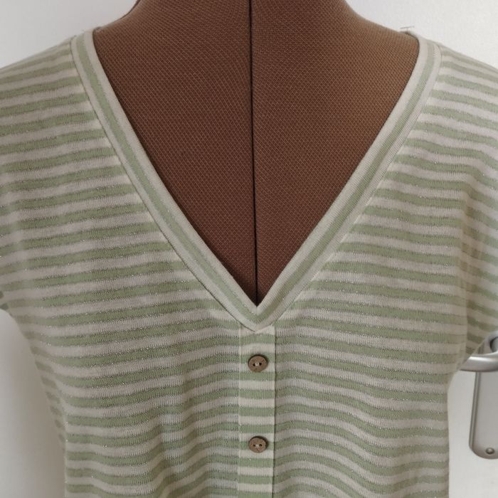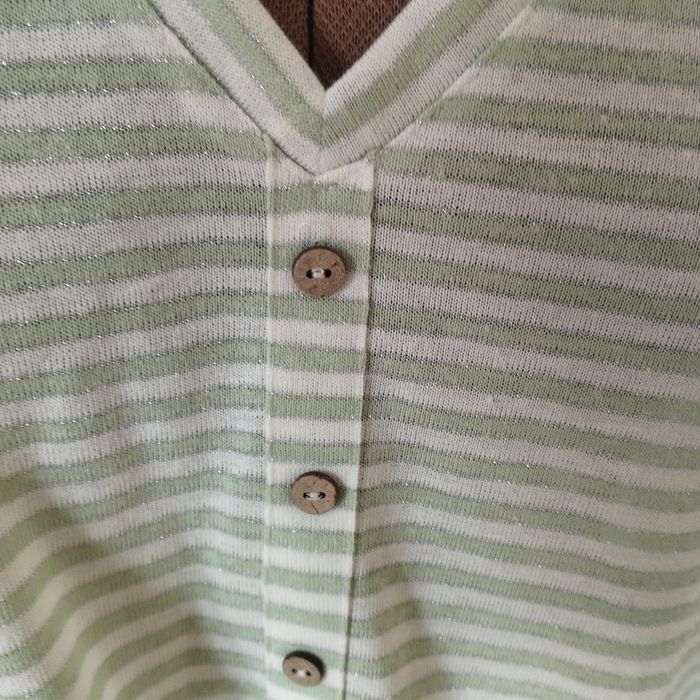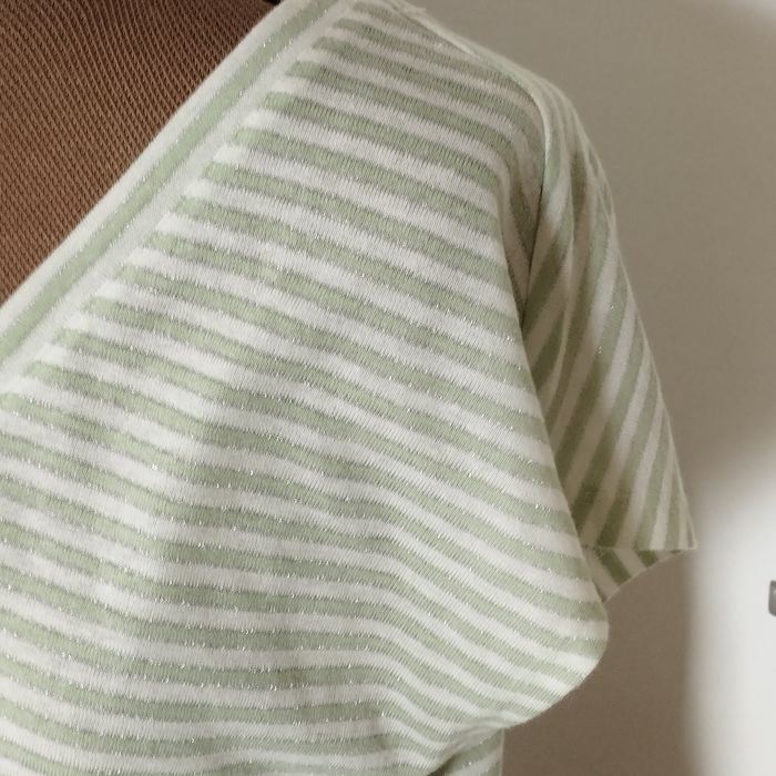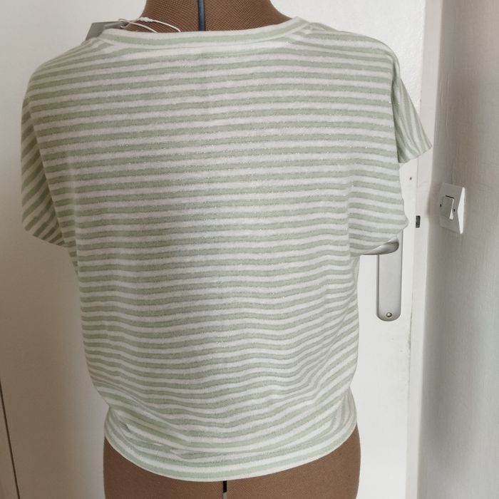 Haut à nouer , Neuf pour femme de chez Only. Taille S. Aisselle à Aisselle 47cm. Hauteur 49cm. 84% Polyester 14%Lin 2% Fibres métalliques argentées. A rayures vert amande, écru, argenté. Son prix d'achat 25€. 36/38