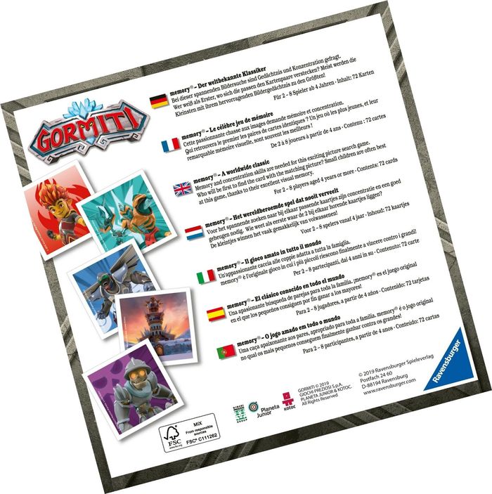 RAVENSBURGER MINI MEMORY GORMITI 48 PIECES 20609 Produit neuf dans son emballage d'origine non ouvert. ENFIN UN MEMORY A L'EFFIGIE DE NOS HEROS !! CONTIENT 48 CARTES AGE CONSEILLE A PARTIR DE 4 ANS ET PLUS