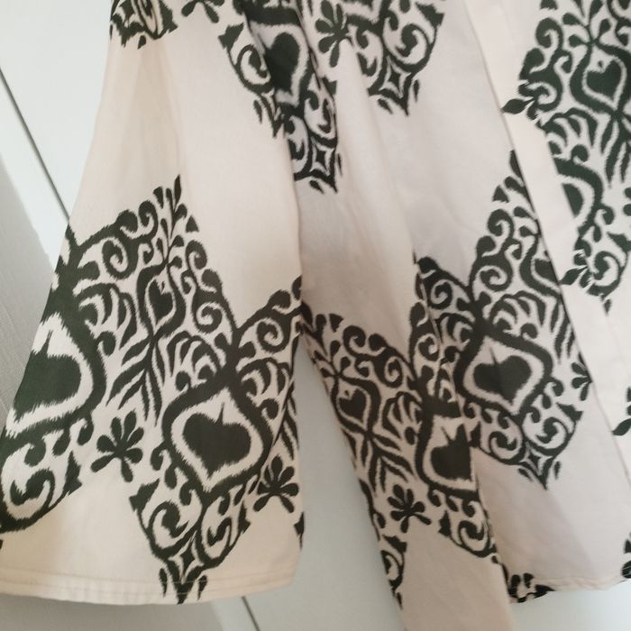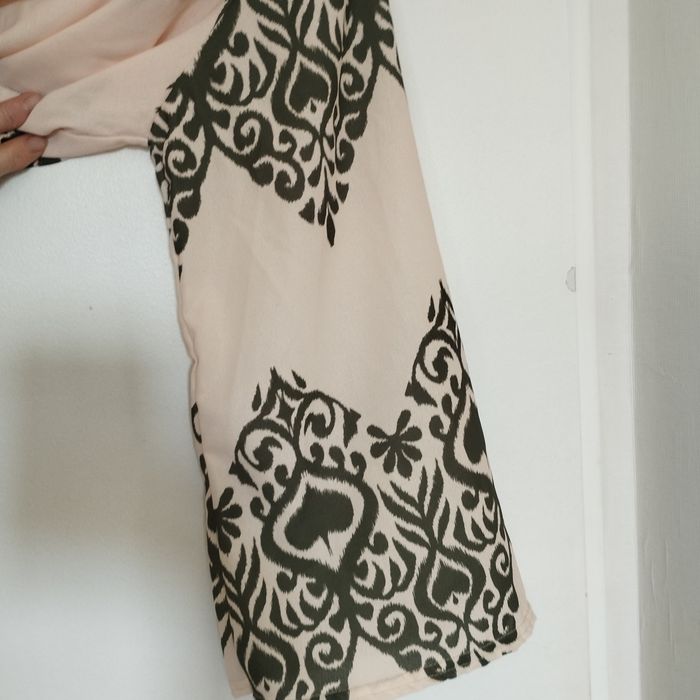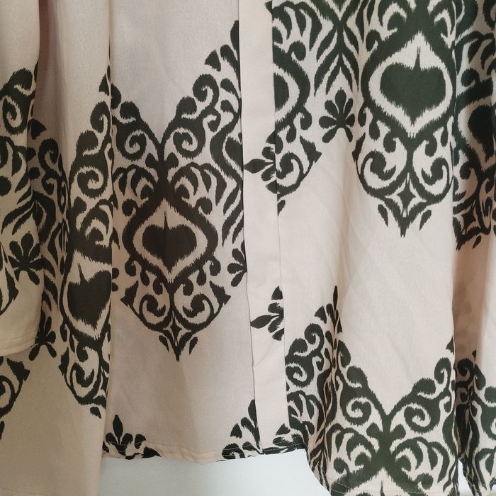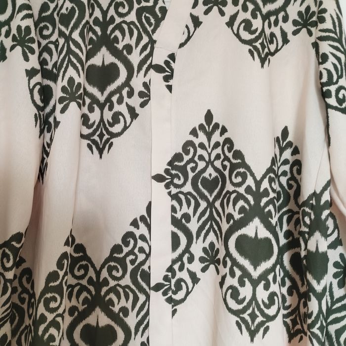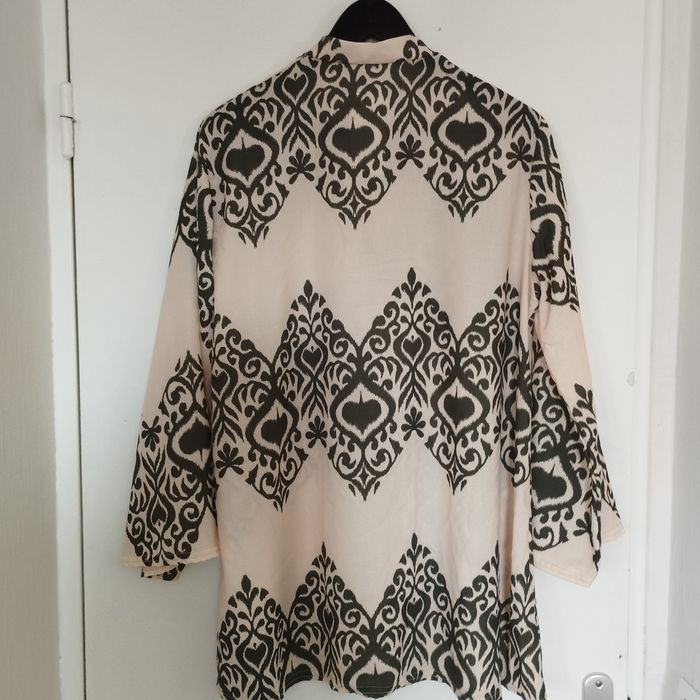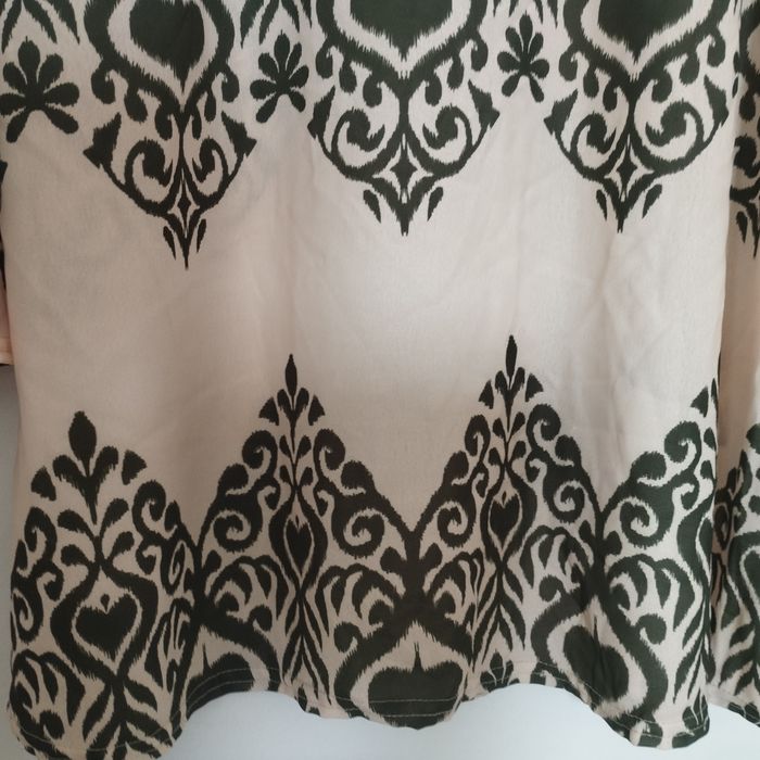 Tunique Neuf pour femme de chez Bella Paris, fabrication Française. Epaule à Epaule 45cm. Aisselle à Aisselle 59cm. Longueur 77cm. Couleurs écru/beige et vert olive. Larges manches.