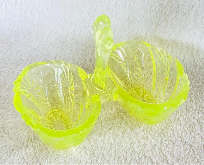 Salière ouraline ciselé ancienne jaune, vintage Dimension : 12 x 8, hauteur 9cm Jaune vert vif fluorescent ⛔️ Prix FIXES, NON négociables 🚨  👏🏻 Réductions sur les lots 👍🏻 #saliere #poivriere #vintage #jaunefluo #cc_divers