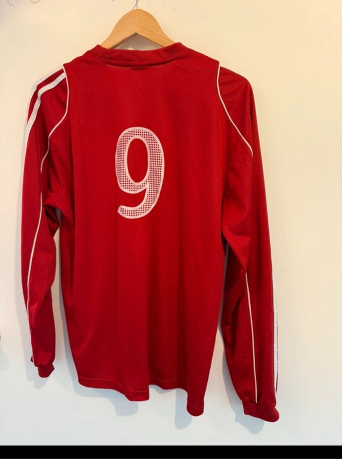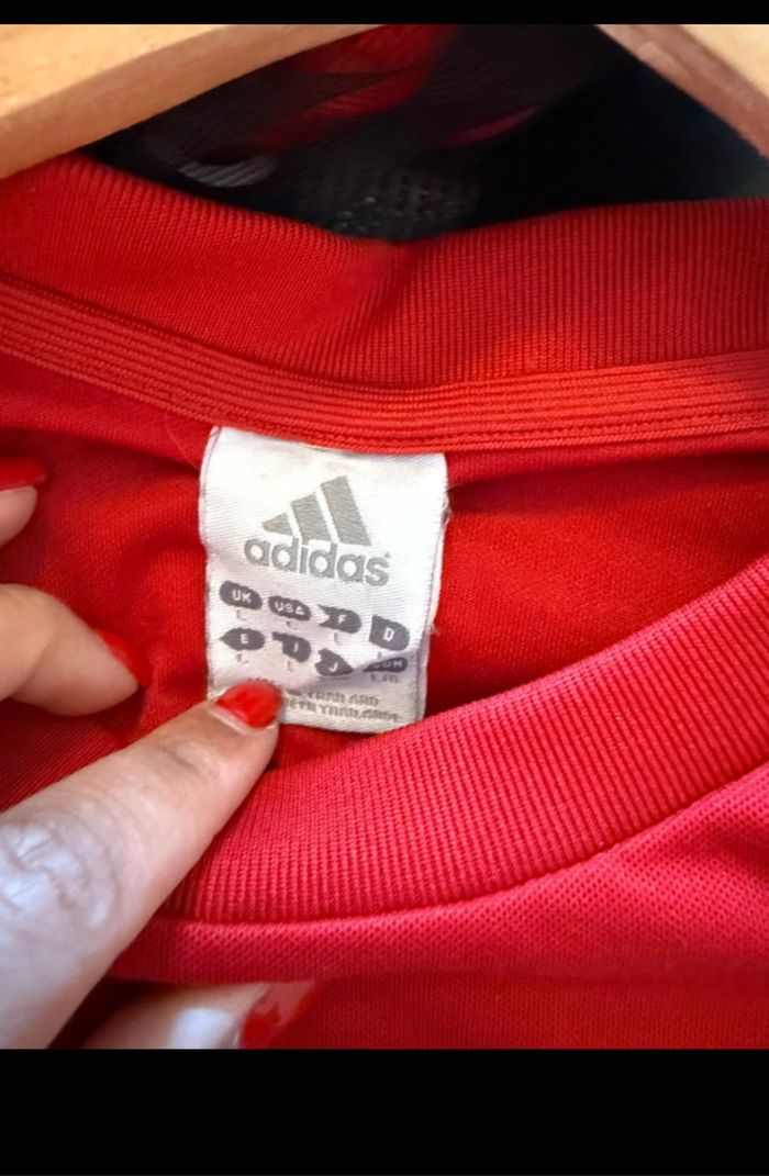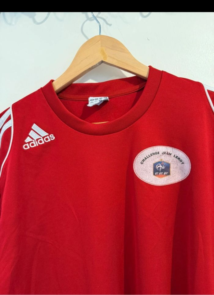 Sweat de sport Adidas, modèle officiel FFF (Fédération Française de Football), Confortable et idéal pour les entraînements, les matchs ou les supporters. ⚽️ Taille 40. ⚽️ Couleur rouge avec bandes blanches sur les manches ⚽️ Logo Adidas brodé sur la poitrine ⚽️ Numéro 9 floqué dans le dos.