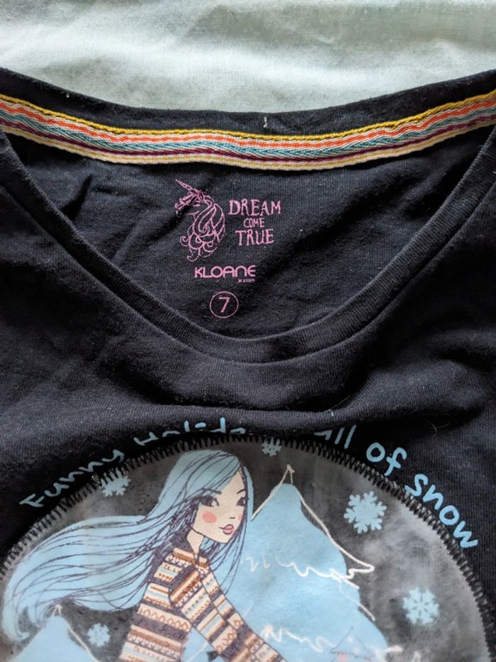 Tee-shirt manches longues 7 ans, marque kloane, le plastique qui contient les perles de neige est un peu terni, sinon pas de défaut Réduction sur les lots Merci d'éviter les envois par vinted go