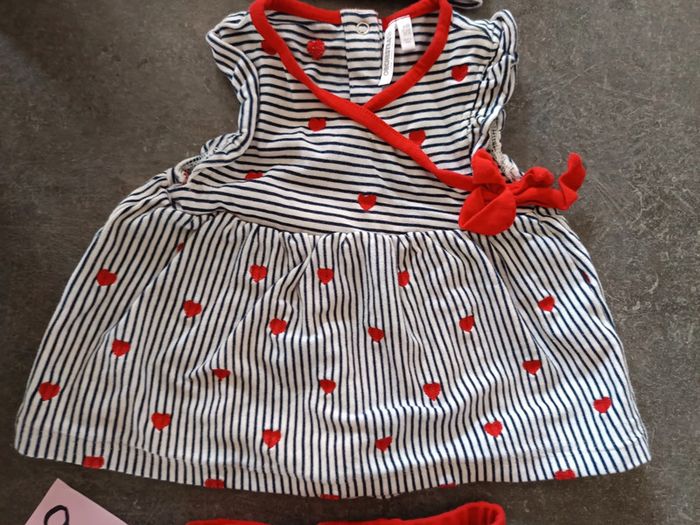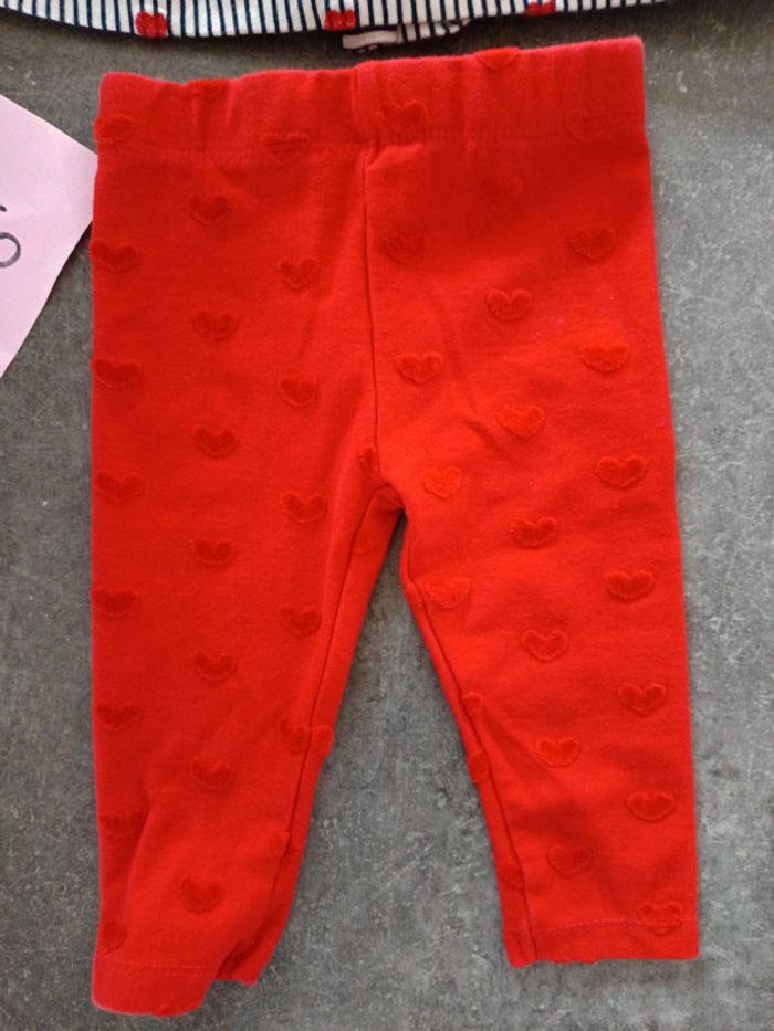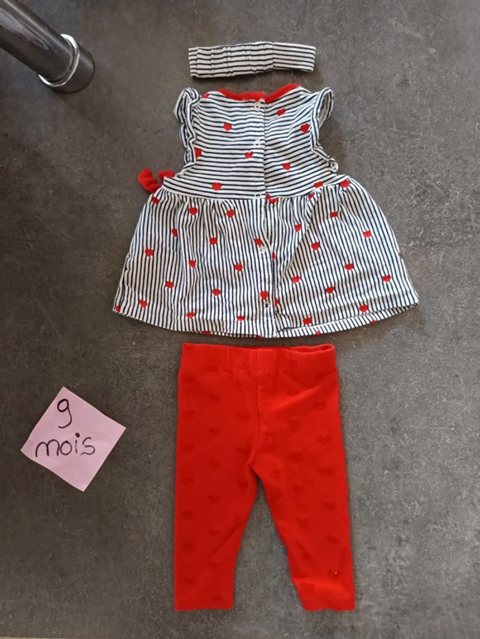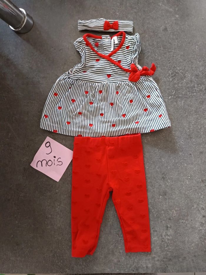 Ensemble 3 pièces : - 1 bandeau à rayures avec noeud rouge - 1 tunique à rayures et coeurs rouges - 1 legging rouge avec coeurs EXCELLENT état, porté qu'une fois ! Taille 9 mois #vetementbebefille9moisjustine182129