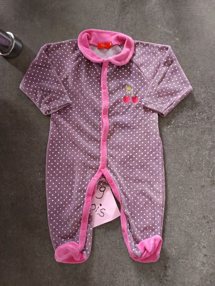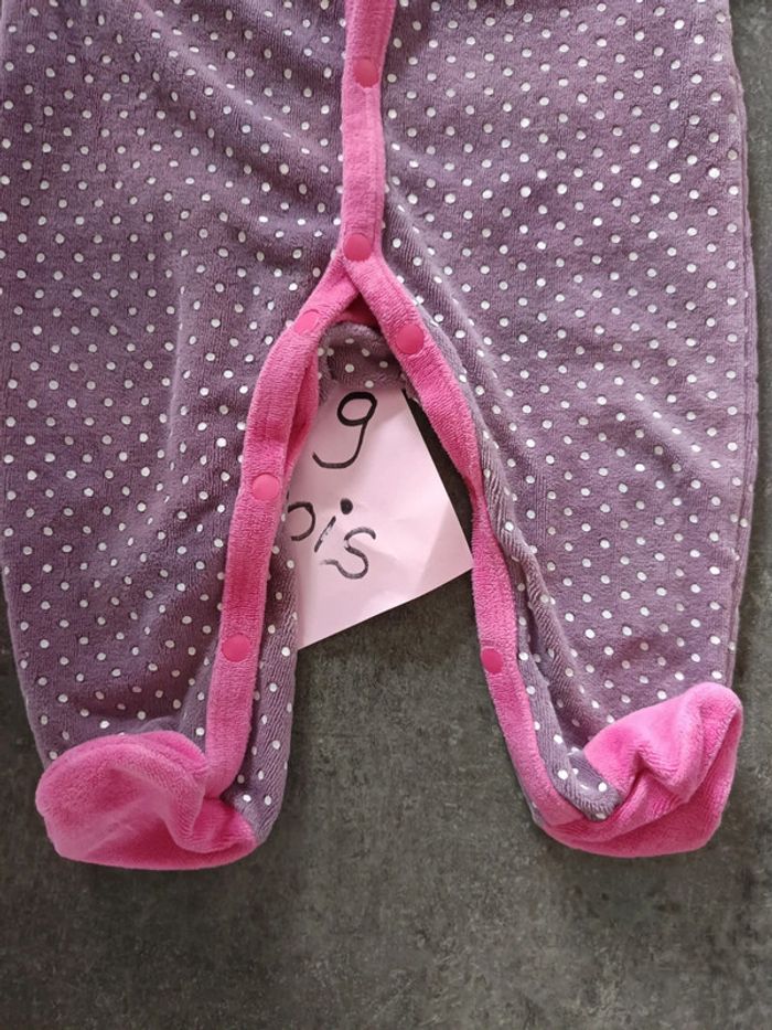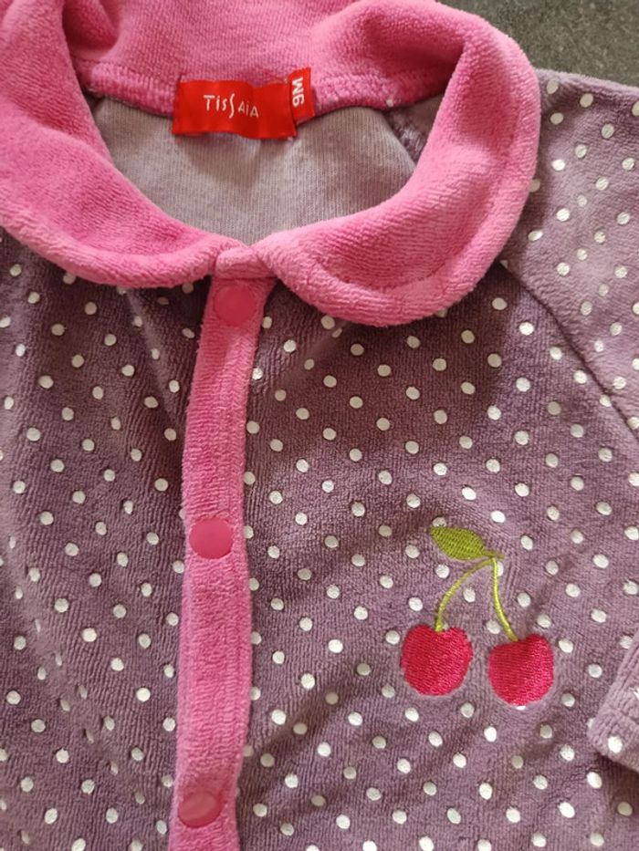 Pyjama en velours violet et rose à pois blancs, Motif cerises 🍒 Ouverture sur le devant et à l'entrejambe, Très bon état, Taille 9 mois #vetementbebefille9moisjustine182129
