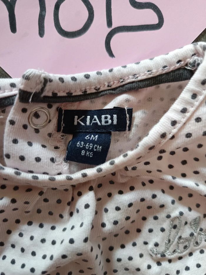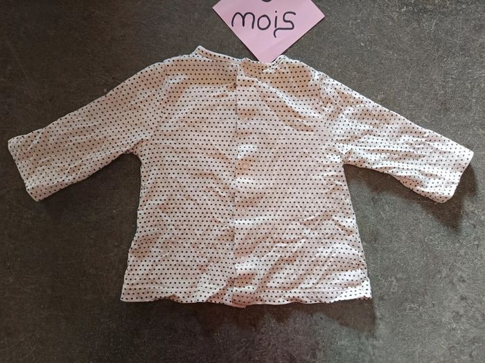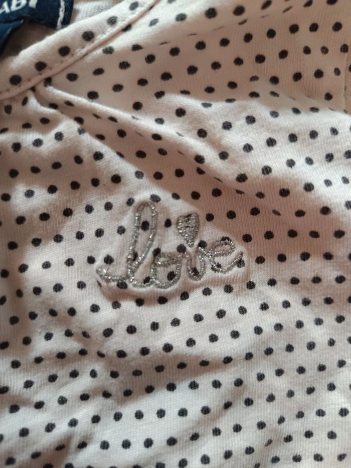 T-shirt manches longues rose clair à pois noirs et inscription "love" avec un petit coeur. Ouverture par pressions dans tout le dos, Très bon état, peu porté ! Taille 6 mois #vetementbebefille6moisjustine182129