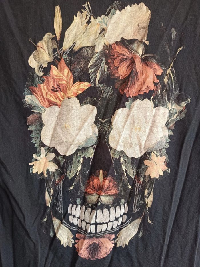 T-shirt noir manches courtes, Motif tête de mort en fleur, Très bon état, peu porté ! Taille M #vetementhommeMjustine182129
