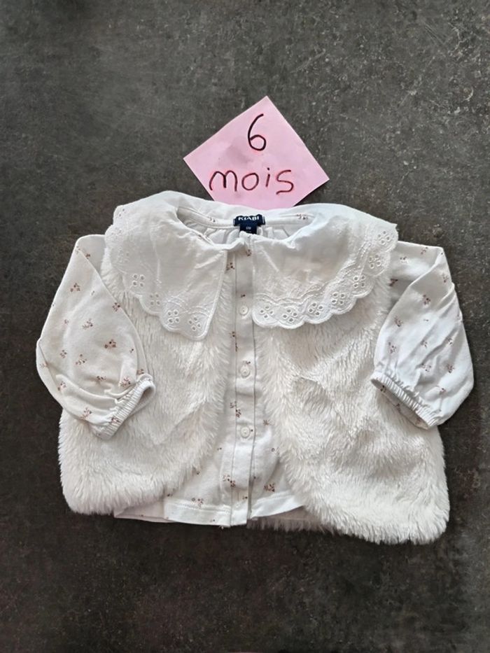 Ensemble 2 pièces : - 1 haut manches longues col claudine, blanc avec des fleurs, - 1 gilet moumoute sans manches blanc NEUF jamais porté ! Taille 6 mois #vetementbebefille6moisjustine182129