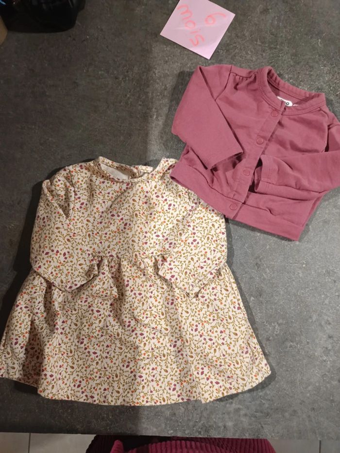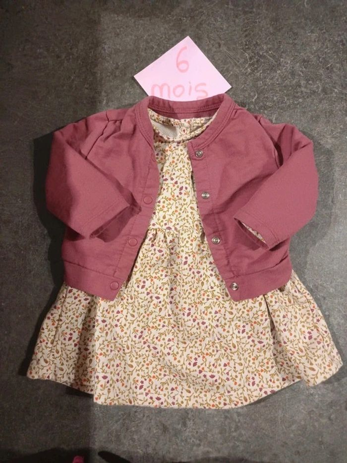 Ensemble 2 pièces : - 1 robe beige motifs fleurs - 1 gilet rose foncé à pressions NEUF jamais porté ! Taille 6 mois #vetementbebefille6moisjustine182129