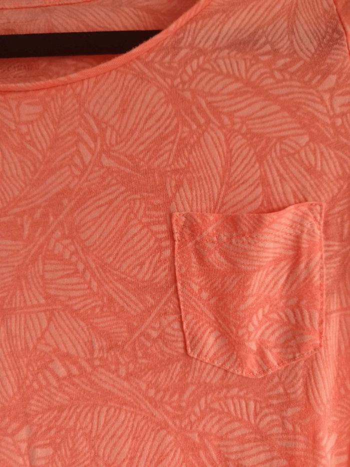 T-shirt manches courtes, Couleur corail, motifs feuilles et petite poche au niveau de la poitrine, Très bon état, Taille S #vetementfemmeSjustine182129