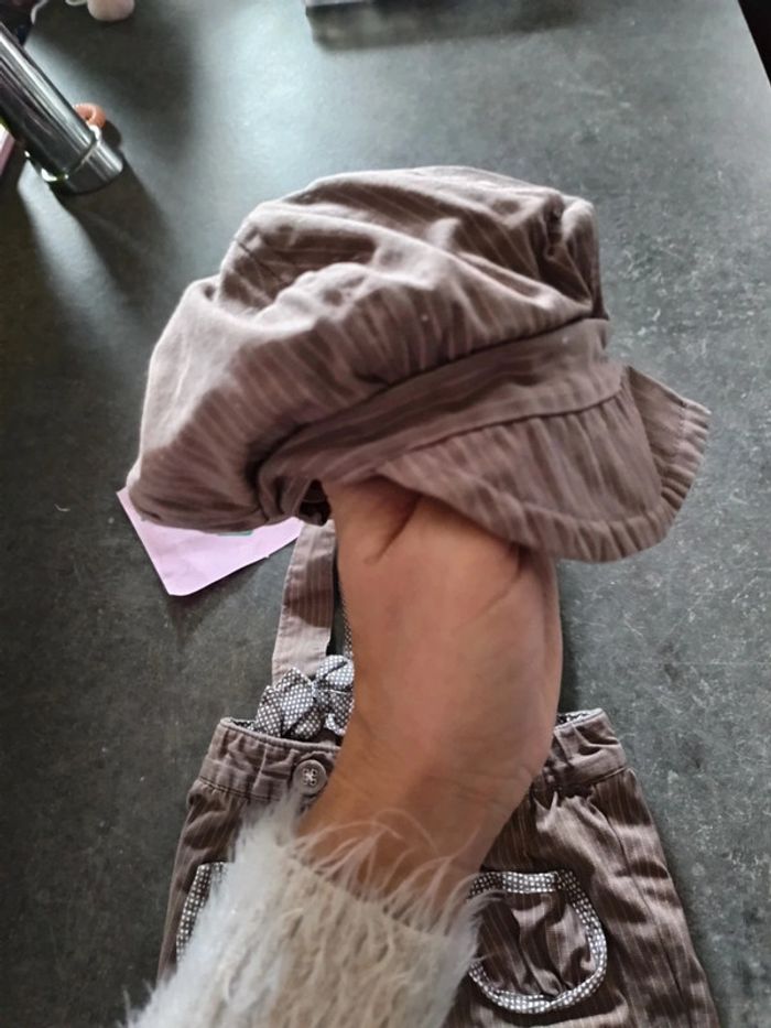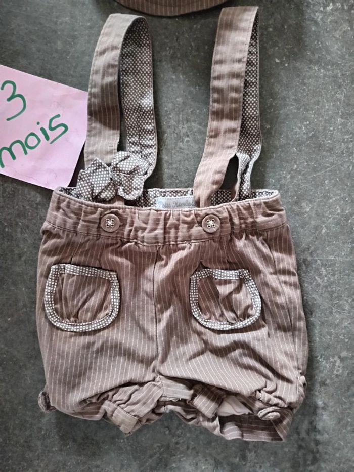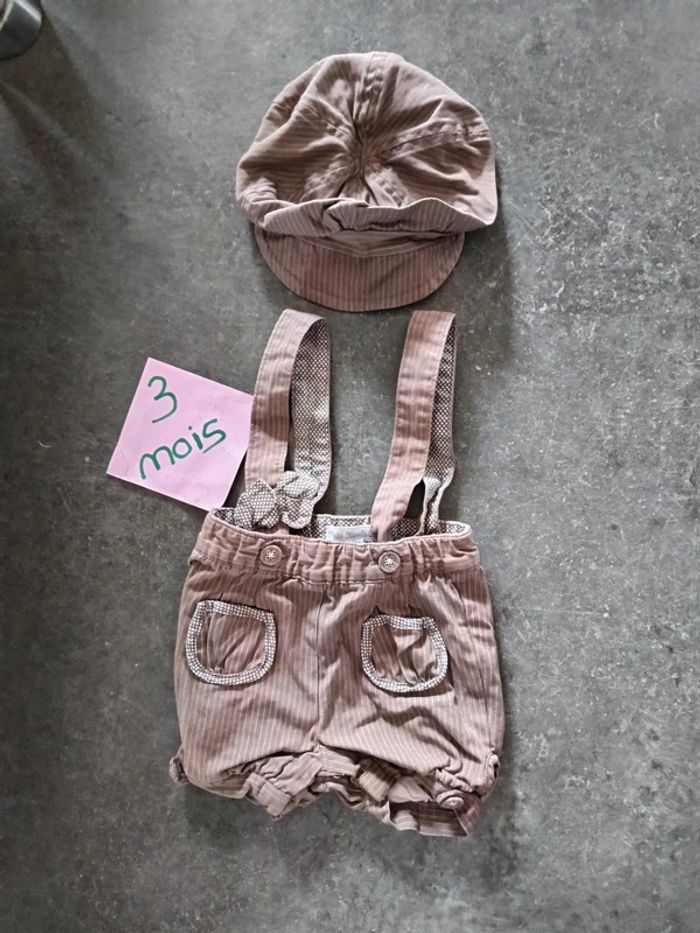 Ensemble 2 pièces : - 1 short salopette, ouverture à l'entrejambe, - 1 casquette Couleur marron et rose, Très bon état Taille 3 mois #vetementbebefille3moisjustine182129