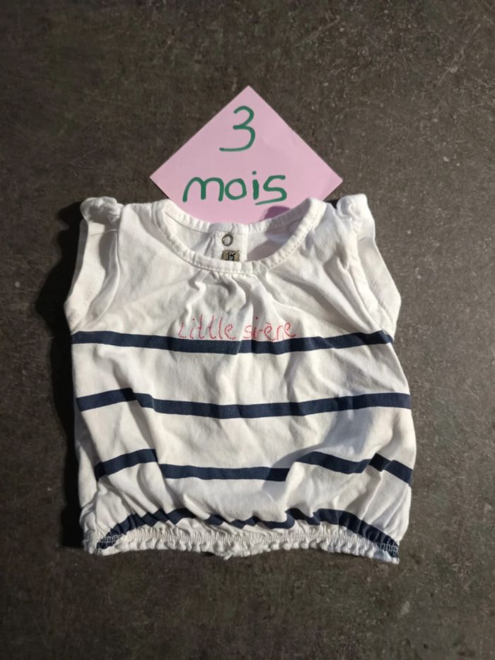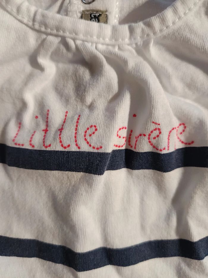 T-shirt manches courtes blanc à rayures bleues marine et inscription "little sirene" pailleté, Très bon état, Taille 3 mois #vetementbebefille3moisjustine182129