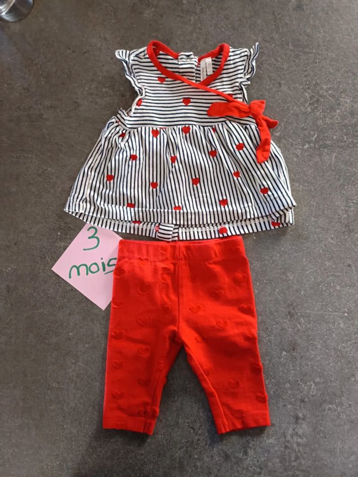 Ensemble 2 pièces : - 1 haut sans manches à rayures et motifs coeurs rouges - 1 legging rouge motif coeur Très bon état, peu porté ! J'ai cet ensemble en 1 mois et 6 mois version manches longues. #vetementbebefille3moisjustine182129