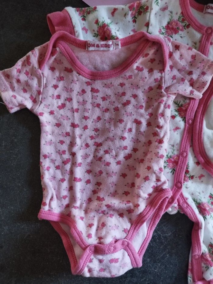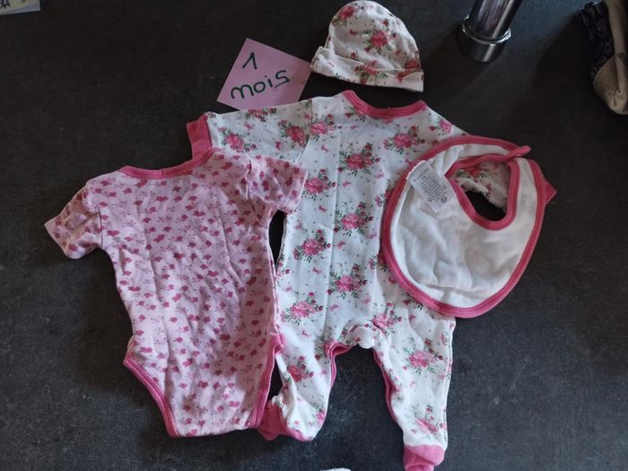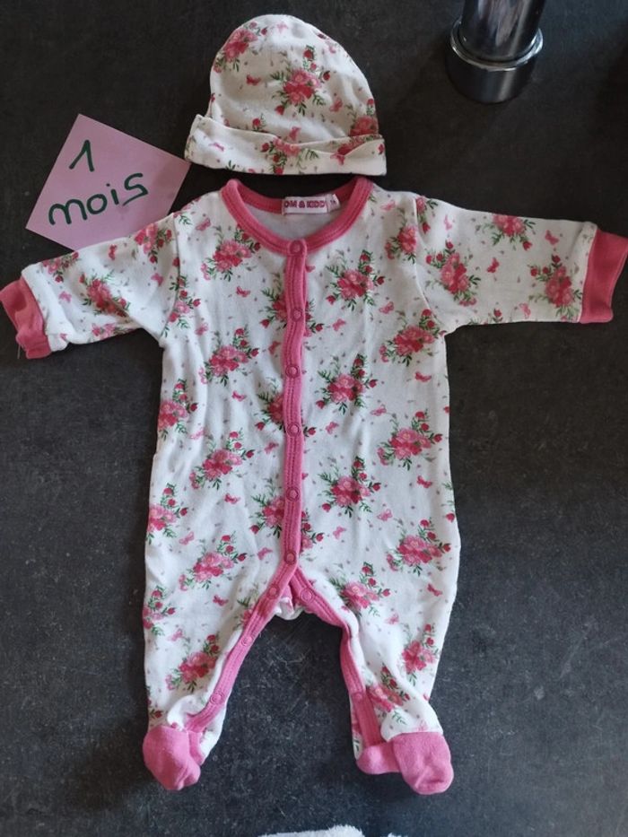 Ensemble blanc et rose fleuri composé : 1 pyjama léger ouverture sur le devant par pression (NEUF) 1 body (très bon état) 1 bonnet (NEUF) 1 bavoir (NEUF) taille 1 mois #vetementbebefille1moisjustine182129