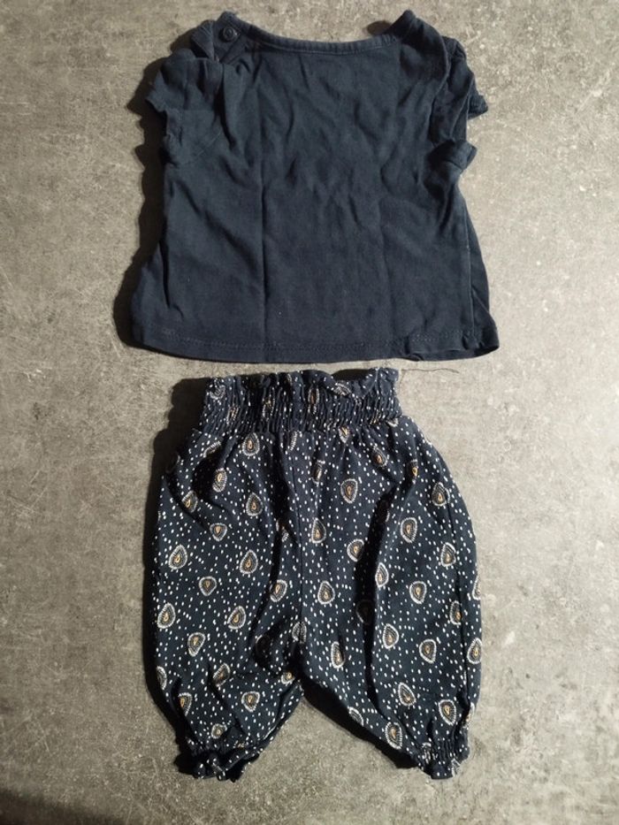 Ensemble été : 1 t-shirt manches courtes bleu marine inscription dorée (my mom i love you) 1 pantalon fluide, élastique à la taille Très bon état, peu porté ! Taille 1 mois #vetementbebefille1moisjustine182129