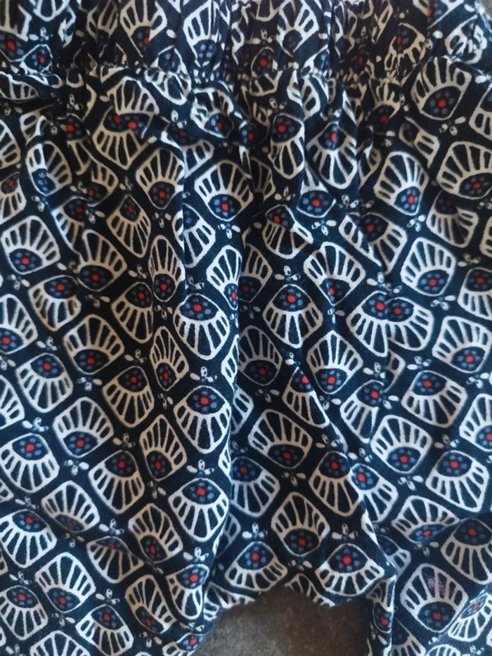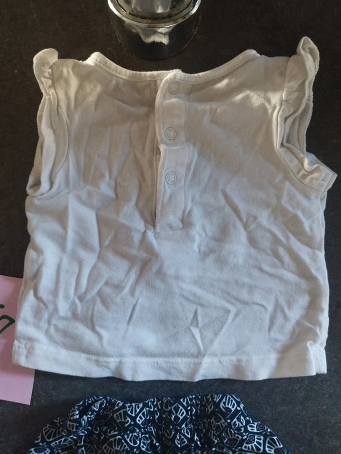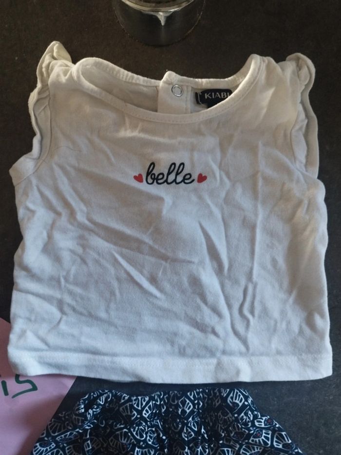 Ensemble été : 1 t-shirt blanc manches courtes avec 2 coeurs et inscription "belle" 1 pantalon fluide bleu à motifs blancs et rouges Très bon état, Taille 1 mois #vetementbebefille1moisjustine182129