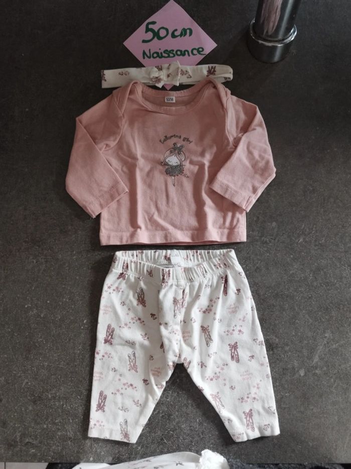 Ensemble 3 pièces comprenant 1 haut rose manches longues avec motif danseuse 1 pantalon avec motifs ballerines 1 bandeau assorti au pantalon. Taille 50/56 cm Très bon état, #vetementbebefille0moisjustine182129 #vetementbebefille50cmjustine182129 #vetementbebefille1moisjustine182129