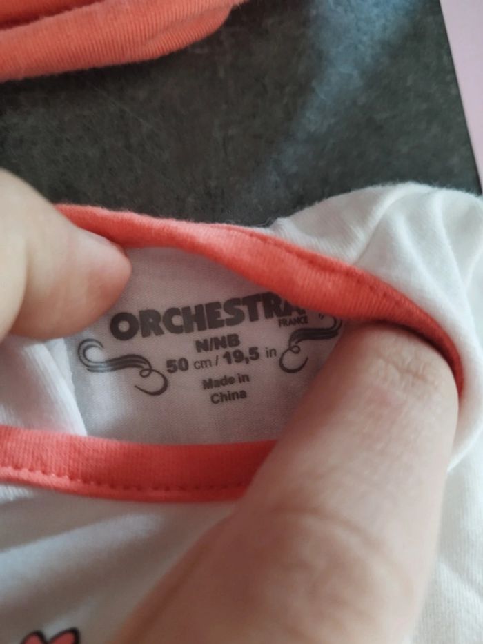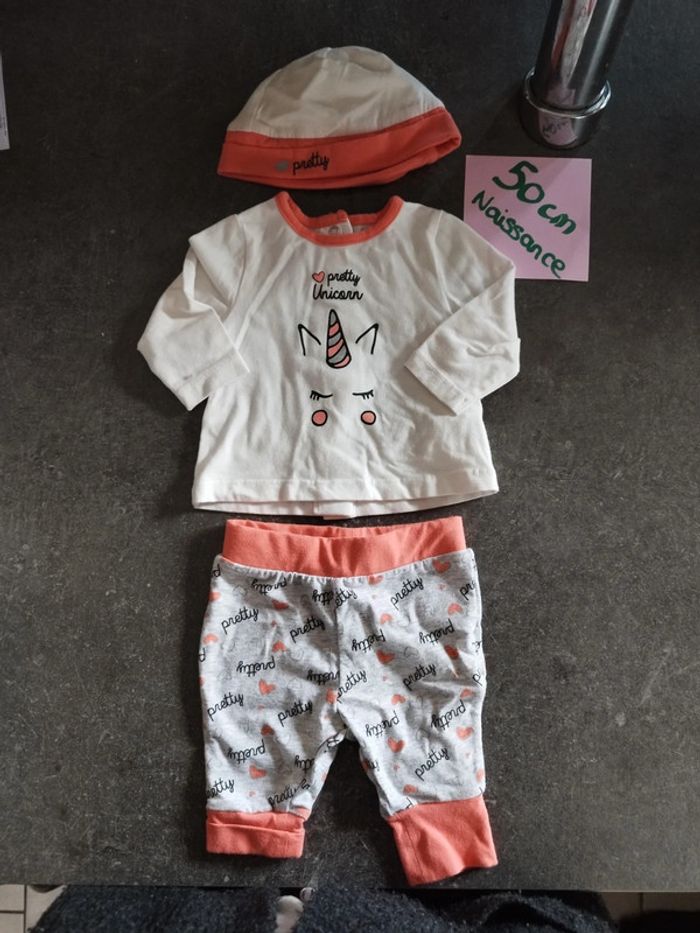 Ensemble 3 pièces comprenant : 1 haut manches longues motif licorne 1 pantalon gris et orange 1 bonnet assorti NEUF jamais porté ! Taille 50cm #vetementbebefille0moisjustine182129 #vetementbebefille50cmjustine182129