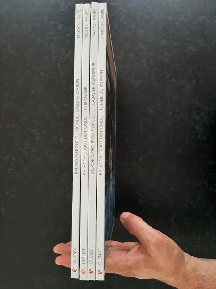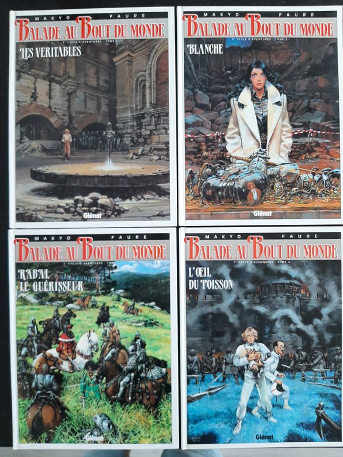 Lot des 4 BD du troisième cycle - Balade au bout du monde En bon état: quelques légers impacts sur les bords, quelques points d'humidité en première et dernière page sur deux BD, et tranche un peu jaunie (voir photos). Regroupe les 4 tomes du troisième cycle de la série de Makyo et Faure: 9. Les Véritables 10 . Blanche 11 . Rabal le guérisseur 12 . L'œil du poisson Envoi rapide et très soigné.