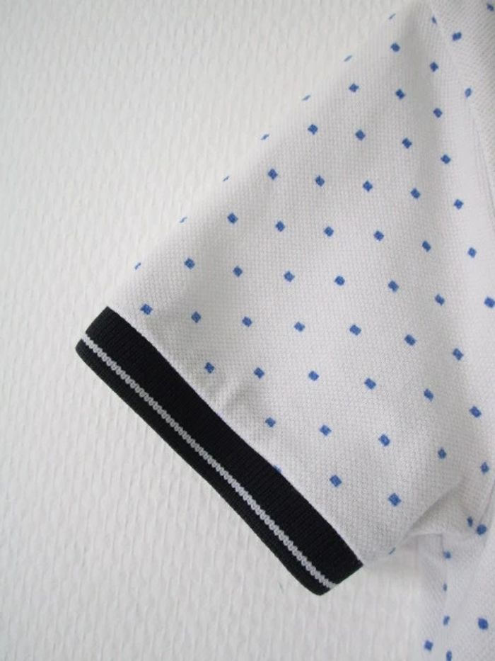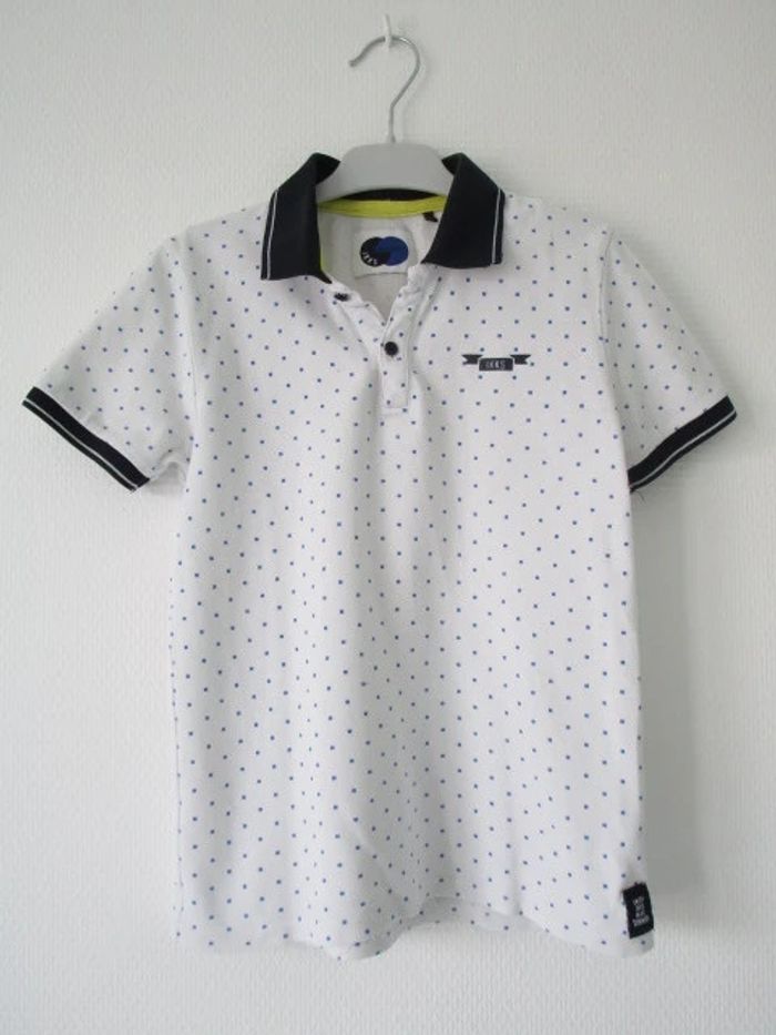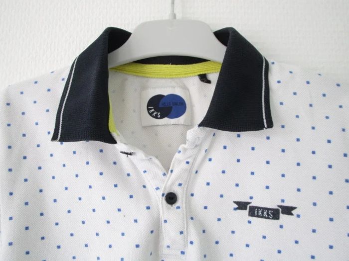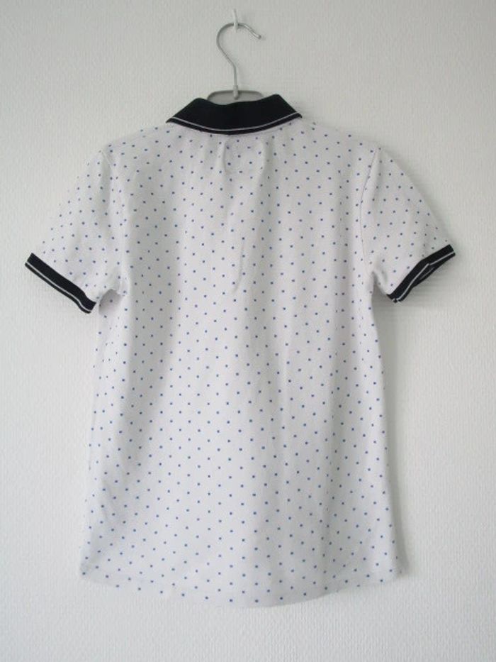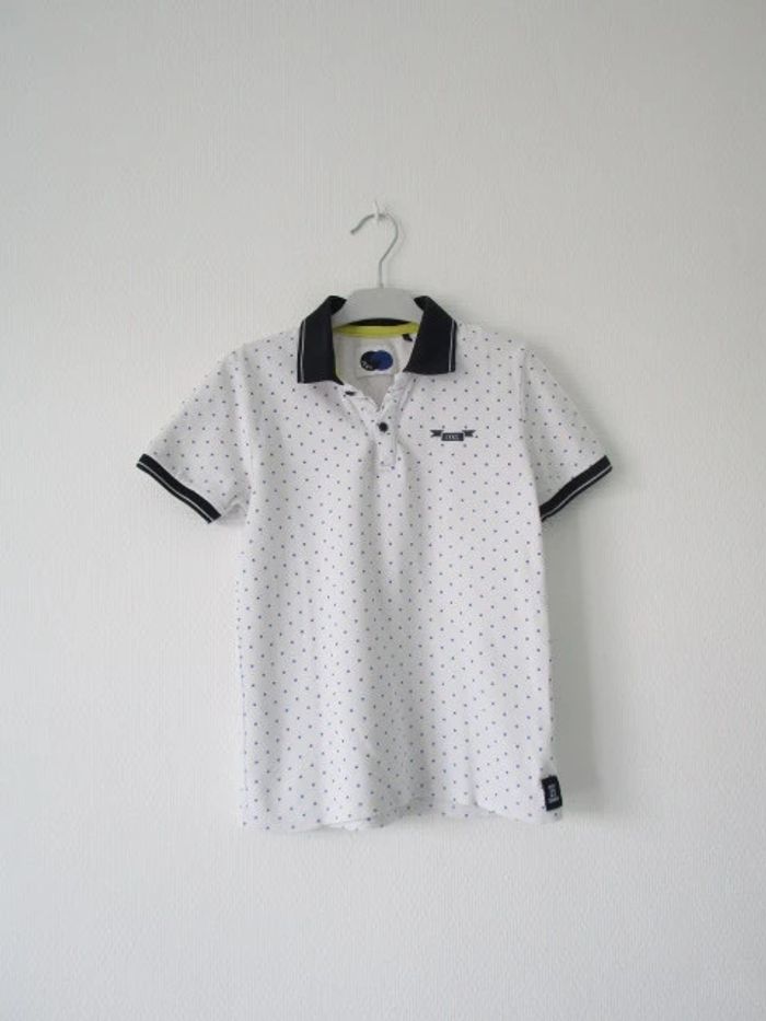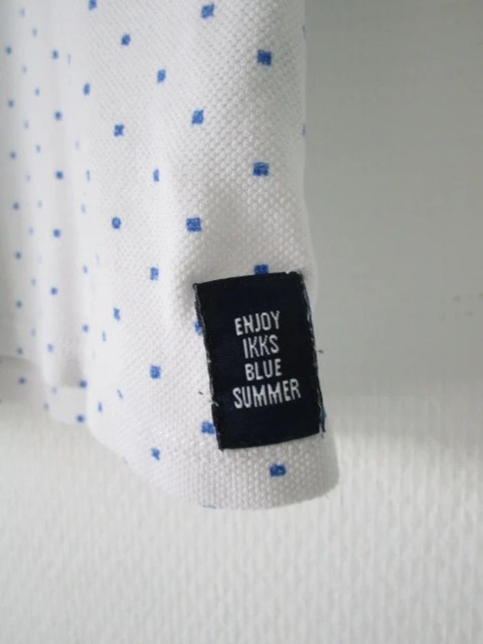 Polo blanc à petits motifs bleus de marque IKKS taille 8 ans Col et bord des manches en bord côte bleu marine 100% coton En très bon état #mamanbrade59garçon8ans