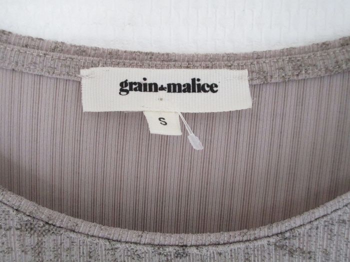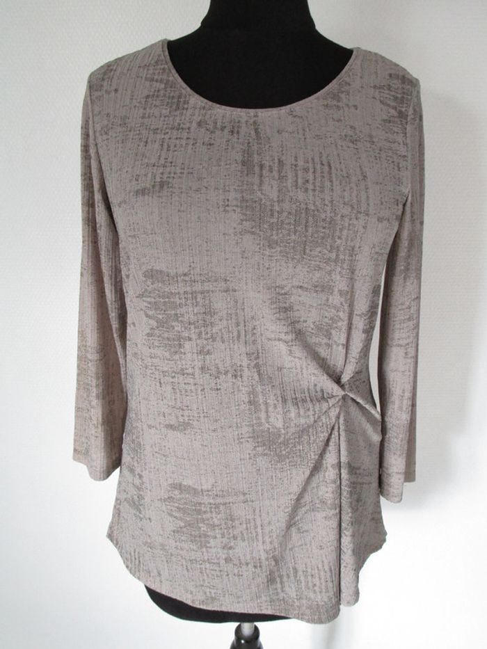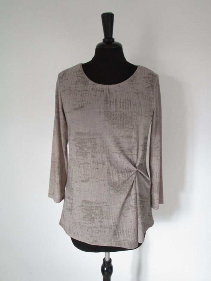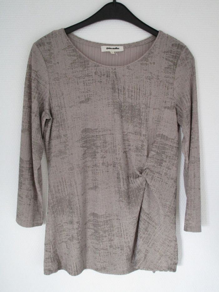 Blouse/t-shirt beige/gris de marque Grain de Malice taille 36 Légèrement pailleté Manches 3/4 Effet nœud sur le côté gauche 95% polyester/5% élasthanne Largeur carrure : 36 cm Largeur aisselle à aisselle : 44.5 cm Longueur : 65 cm NEUF sans étiquette mais le petit lien plastique est encore présent #mamanbrade59femme36