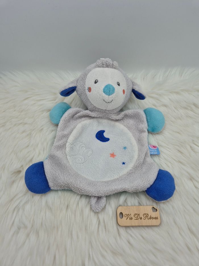 Doudou plat Mouton gris blanc bleu lune étoiles Sucre d’Orge
