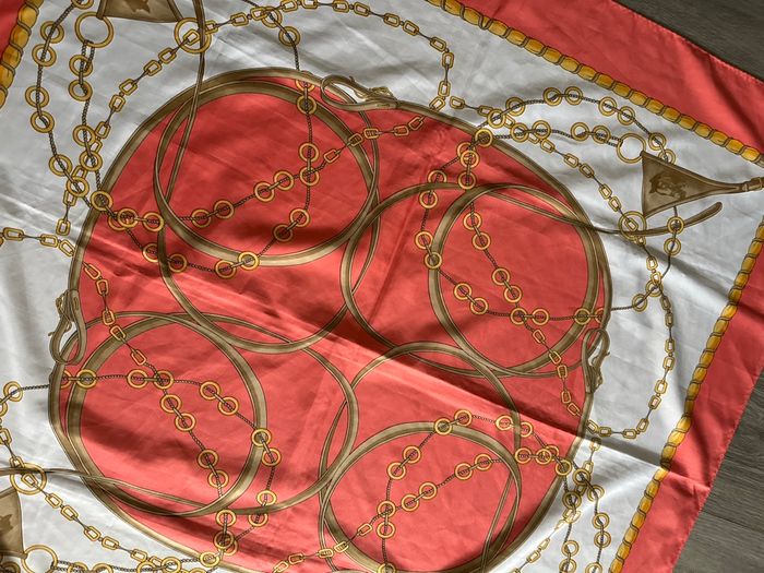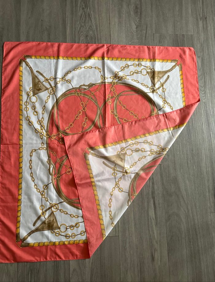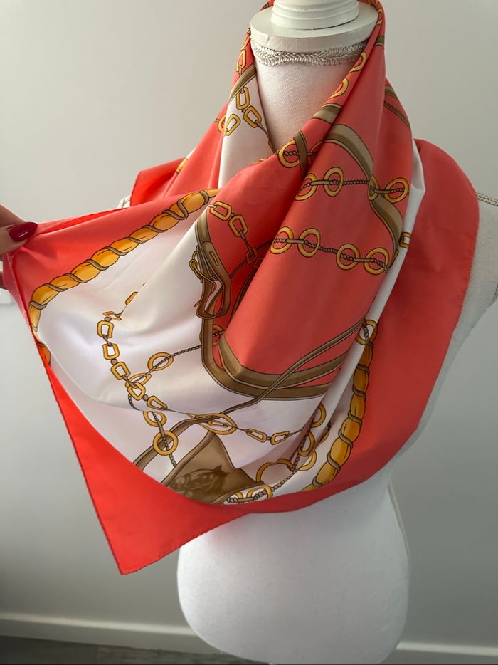 Foulard étole - Excellent état - Imprimés cheveux équitation équestre - Orange corail, doré et blanc - Forme carré - 85x85cm - Vintage, années 80’ - Pas d’étiquette de matière