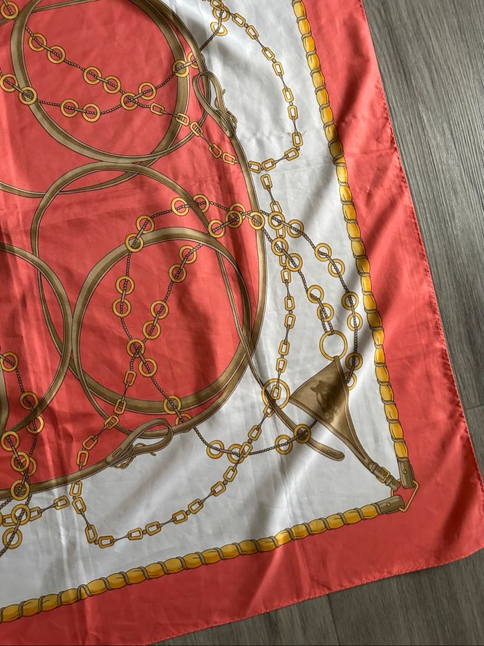 Foulard étole cheval équestre équitation orange corail doré et blanc Vintage 85x85cm - photo numéro 1