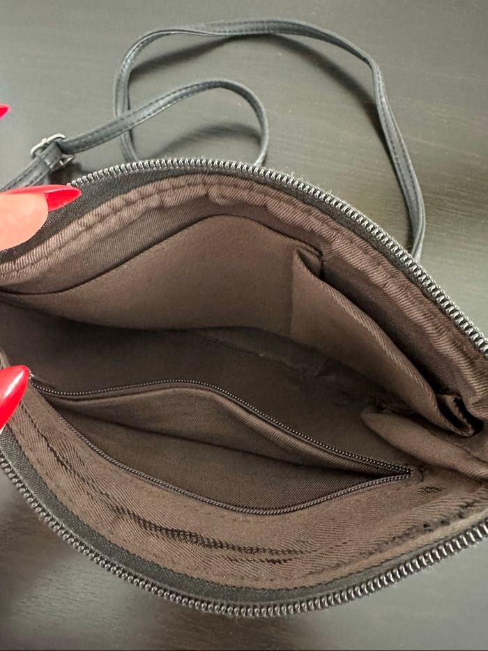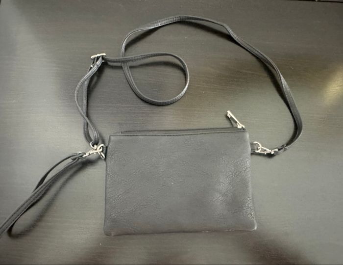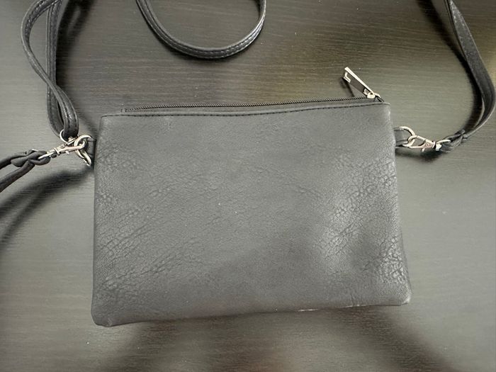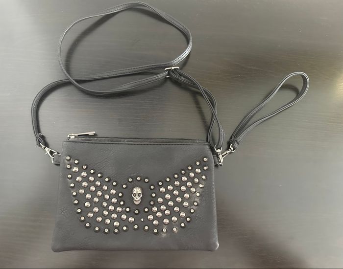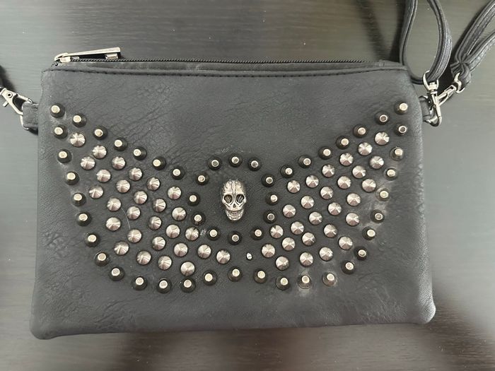 Sac pochette - Excellent état - Noire et argentée - Clous en métal et tête de mort - Se ferme avec un zip - Bandoulière réglable et amovible - Dragonne amovible - Doublure intérieure en tissus marron - À porter en bandoulière ou en pochette Dimensions: - 22cm de large - 15,5cm de haut