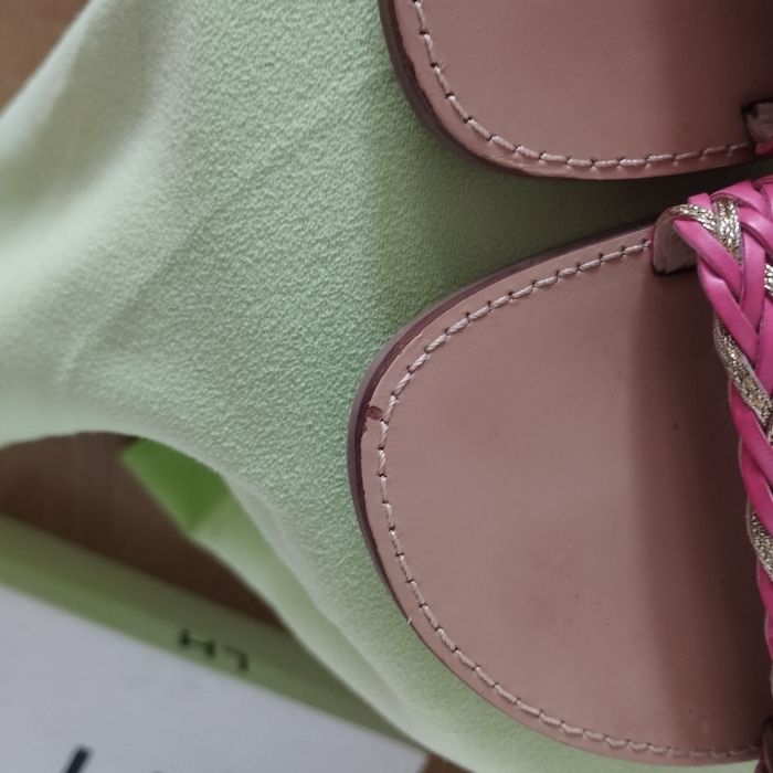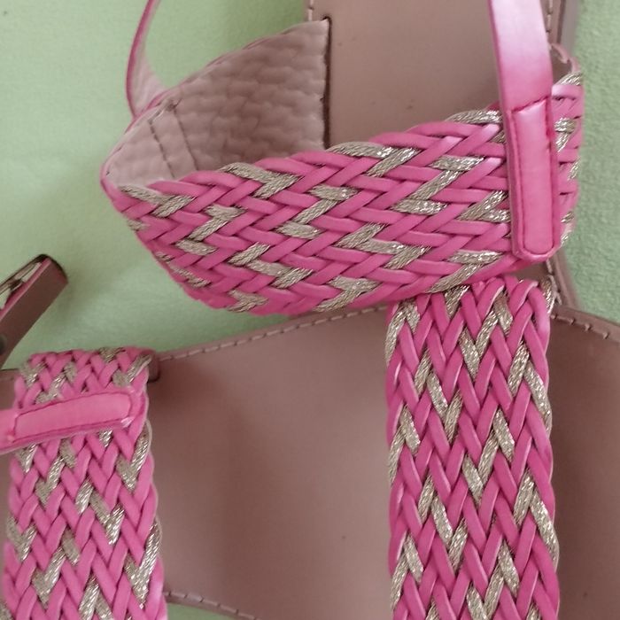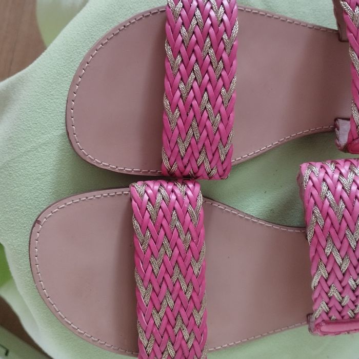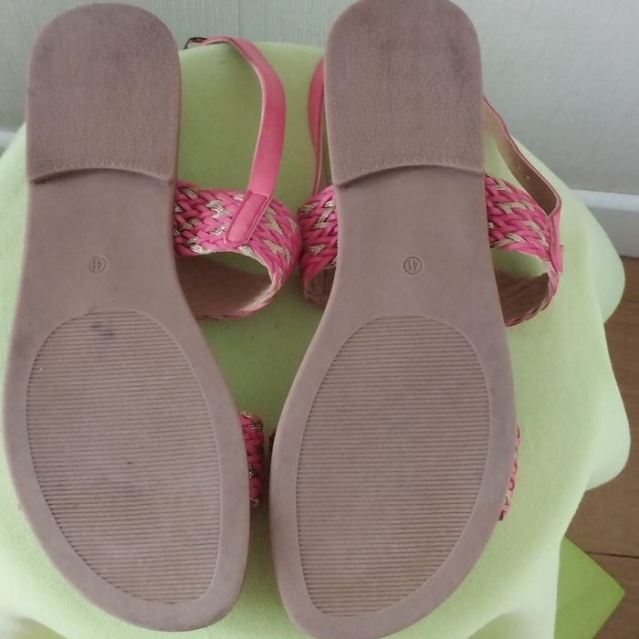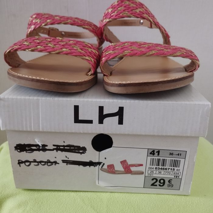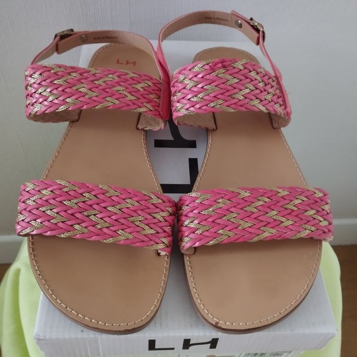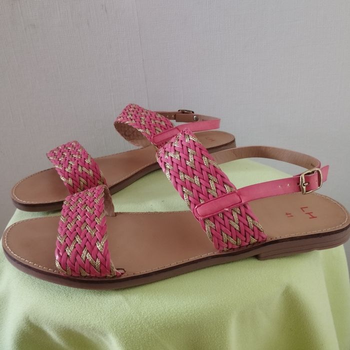 Sandales en cuir pour femme de chez LH Pointure 41. Tresser cuir couleurs rose foncé et doré. Très peu porté, comme neuf. Un minuscule accro devant voir la dernière photo, Ne se voit vraiment pas au porté ! Prix d'achat 30€