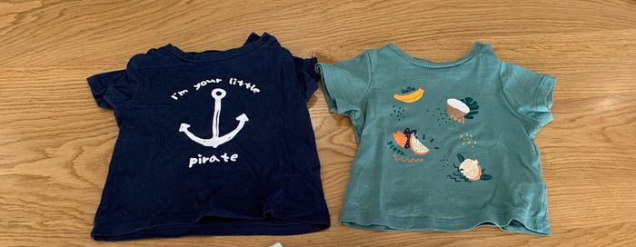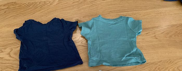 Lot comprenant 2 t-shirts manches courtes : . un bleu marine, In Extenso, en très bon état . & un vert, Tape à l’Oeil, en très bon état. Taille : 6 mois.