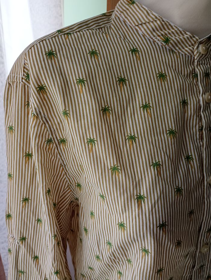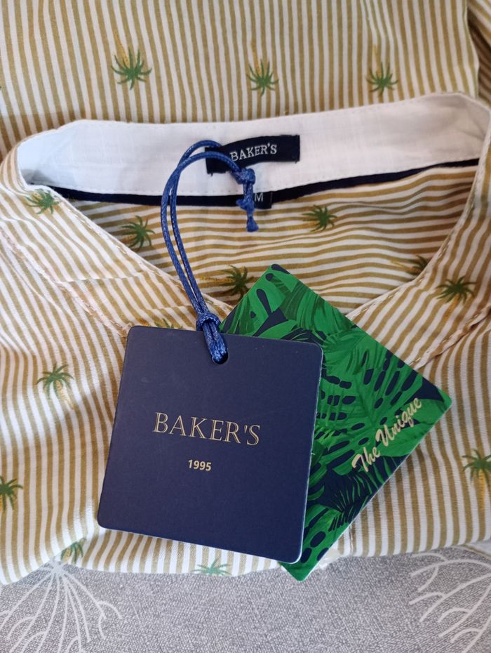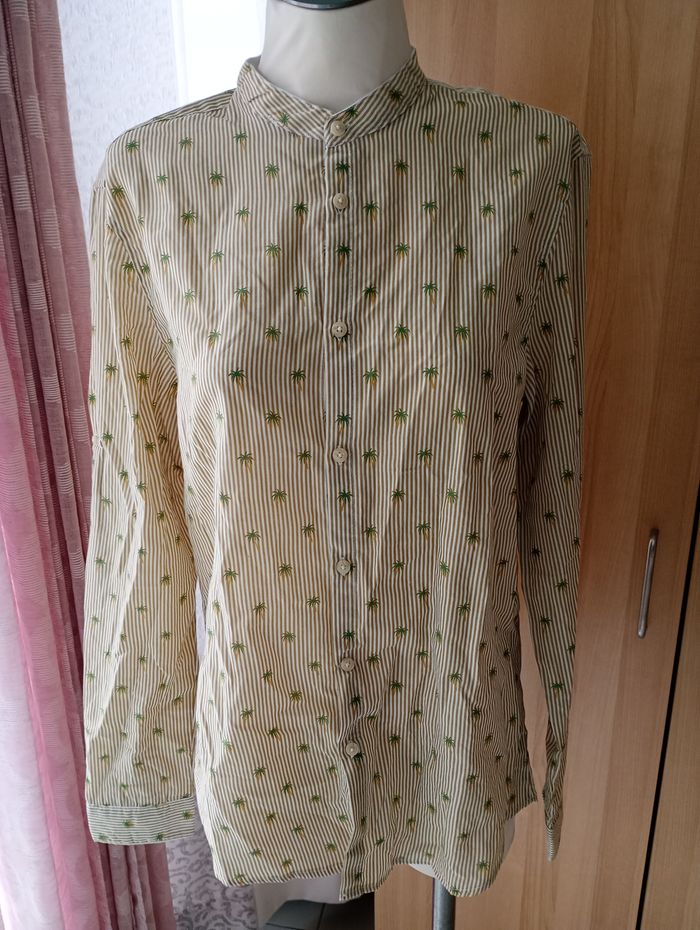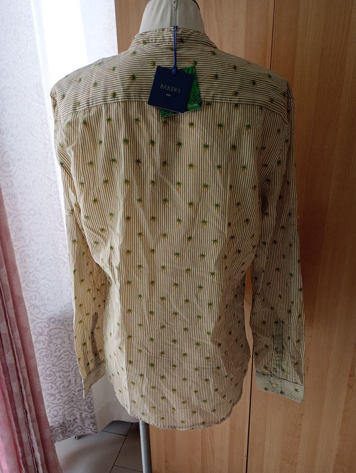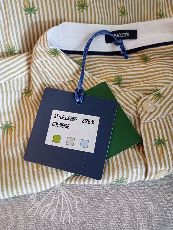 Très belle chemise pour homme. Lignes beiges avec palmiers. Col haut. Coton et Polyester. Taille : M Marque : Bakers. Longueur : 75 cm. Largeur entre aisselles : 50 cm. Longueur manches : 66 cm. Neuve avec étiquette.