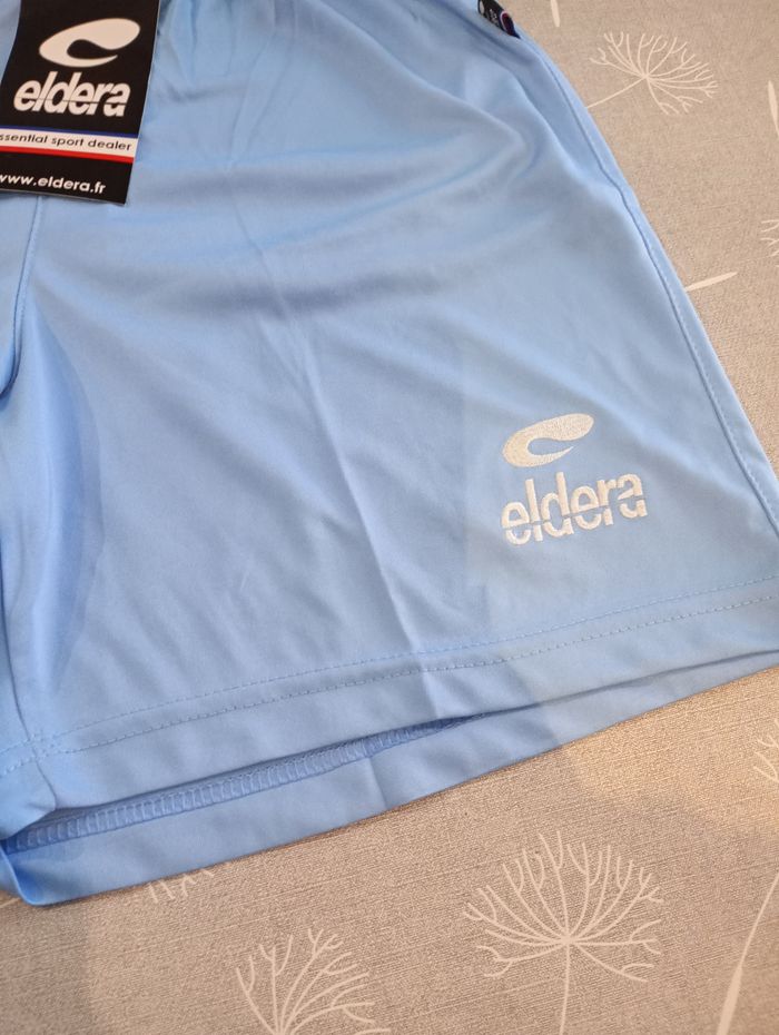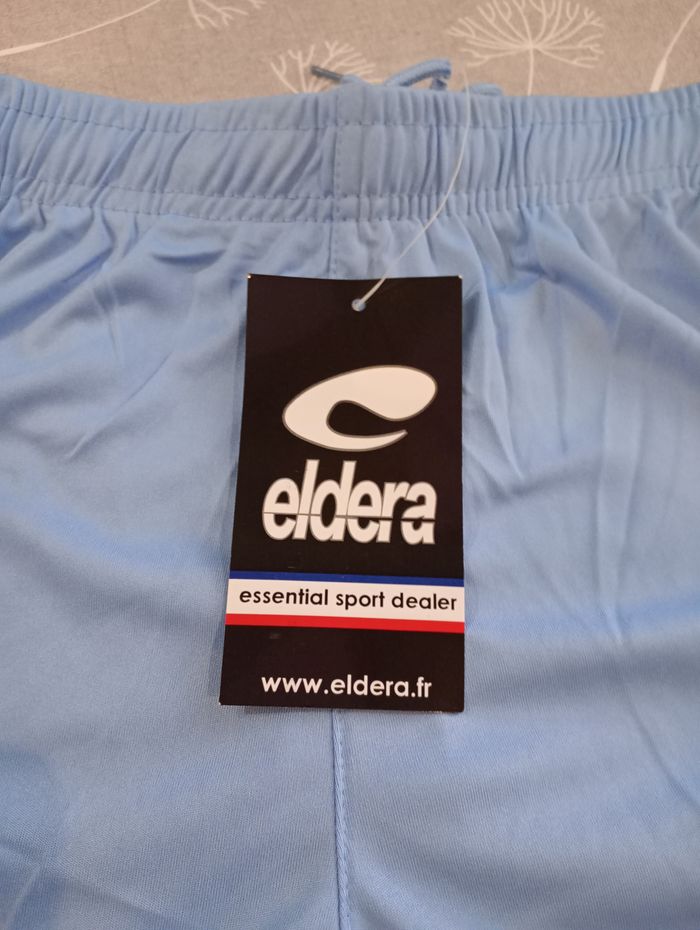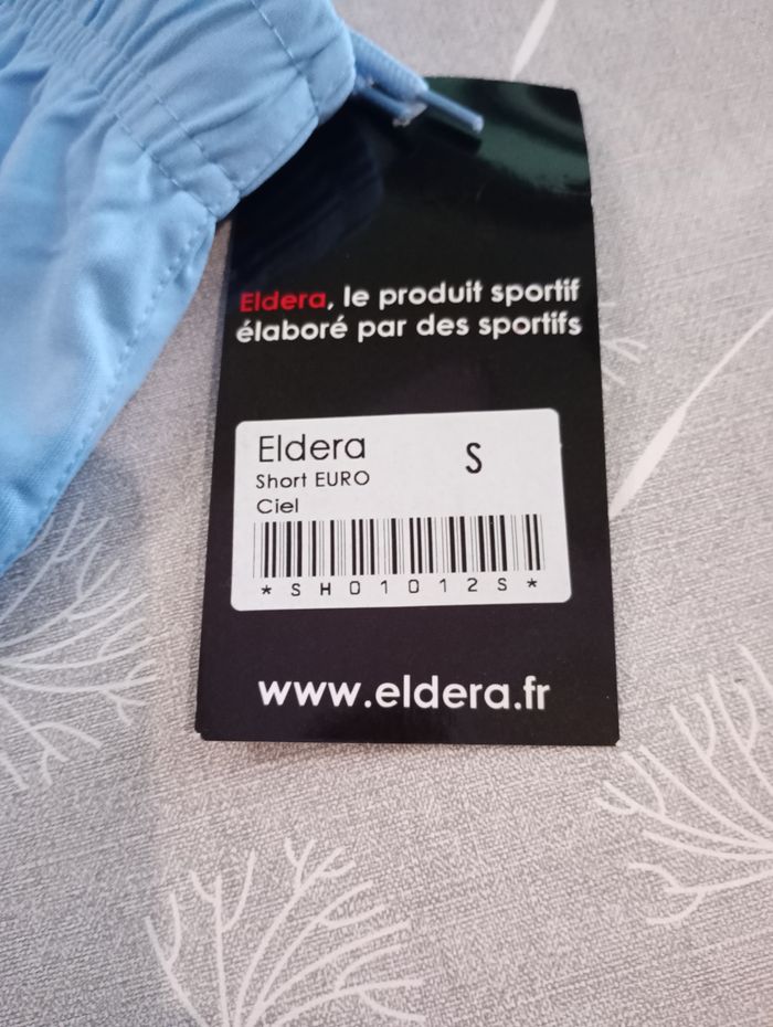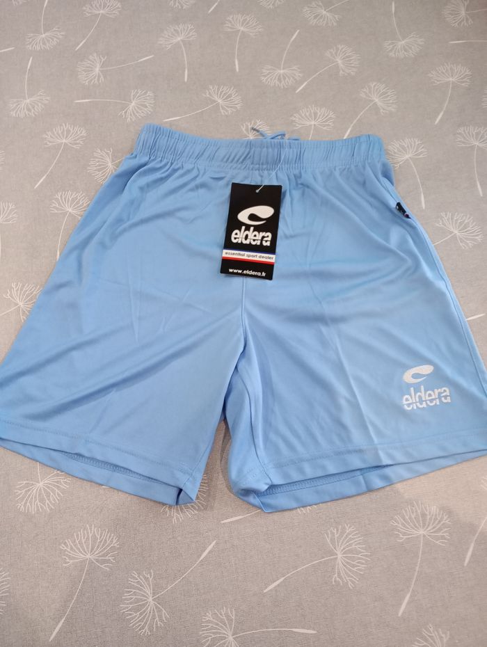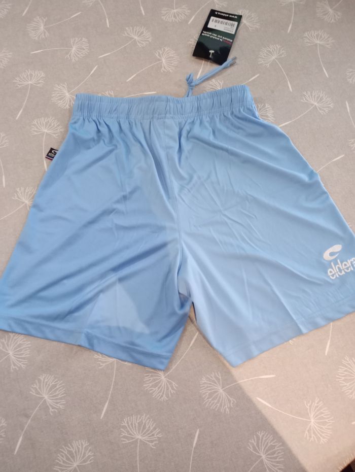 Short de sport pour homme. Bleu clair. 100% Polyester. Longueur : 43 cm. Largeur (taille élastique) : 31 cm. Taille : S. Marque : Eldera. Neuf avec étiquette