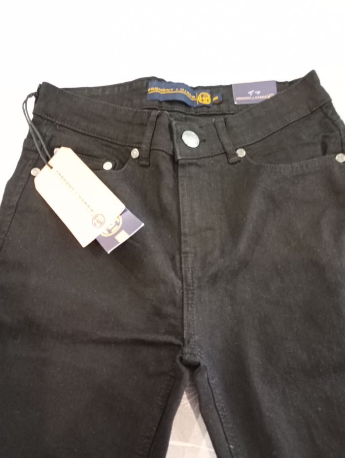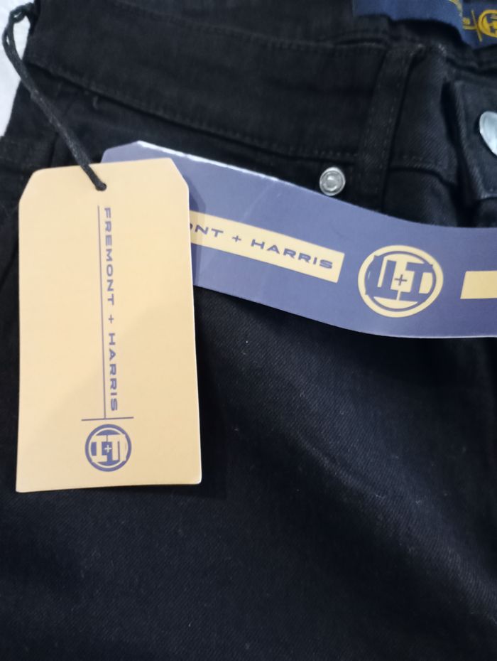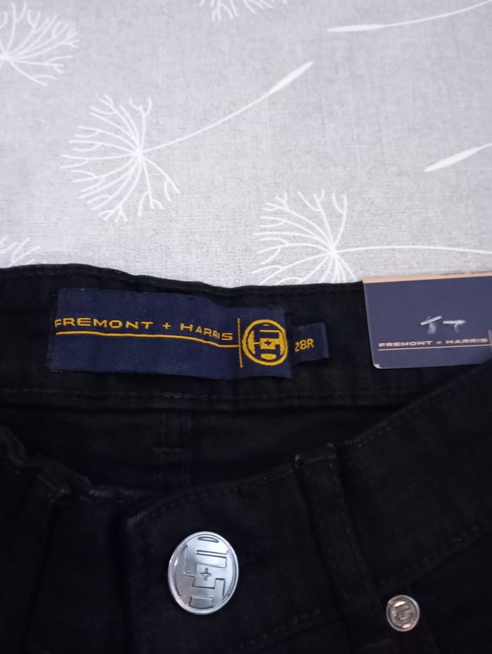 Jeans noir brut. Taille : 28R (correspondrait à un 36). Marque : Fremont + Harris. Longueur : 104 cm Largeur : 32 cm Entrejambe : 78 cm. Neuf avec étiquette.