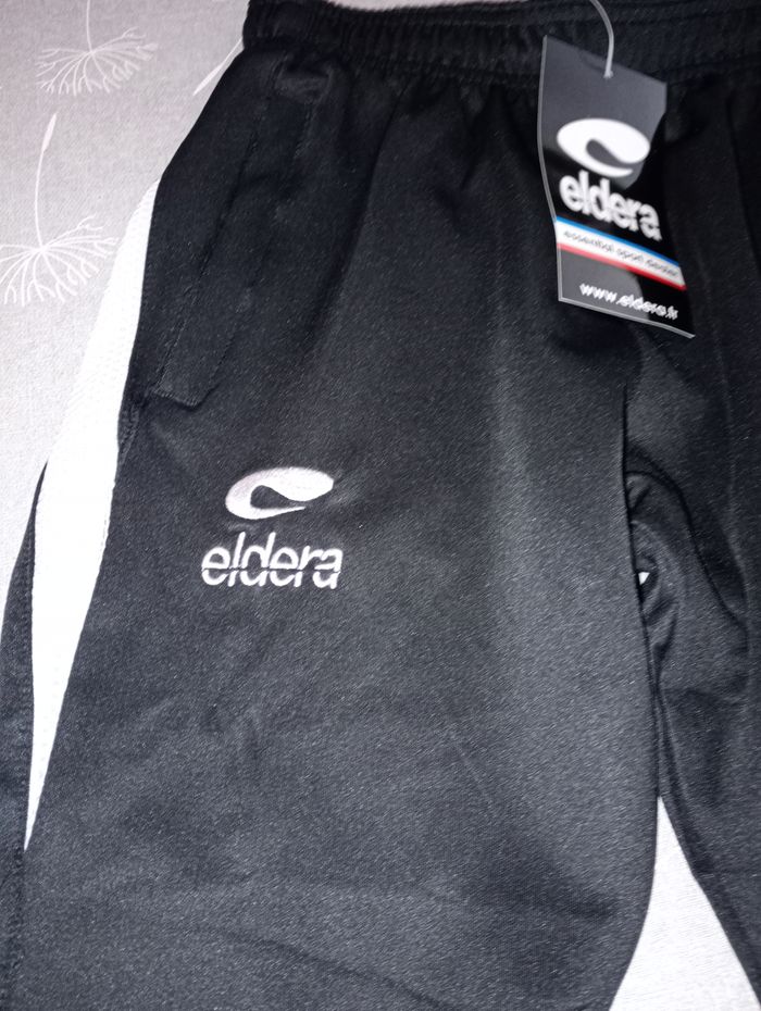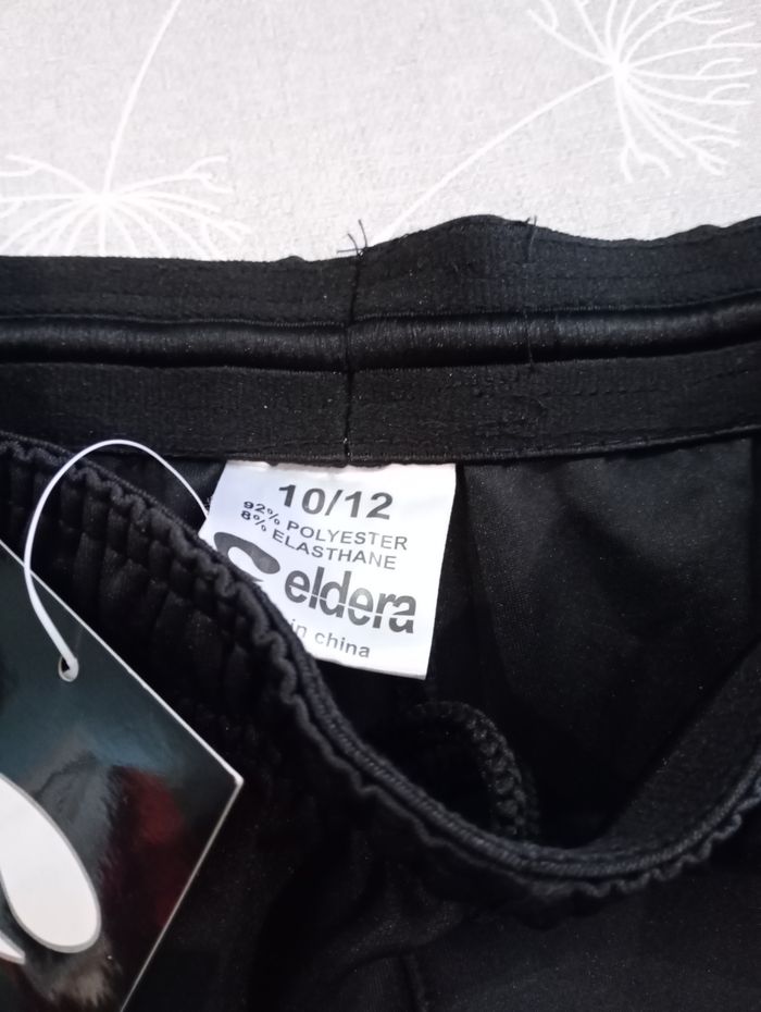 Fuseau de sport pour enfant. Peut se porter serré ou large au niveau des chevilles grâce aux tirettes. Polyester et élasthanne. Taille : 10-12 ans. Marque : Eldera