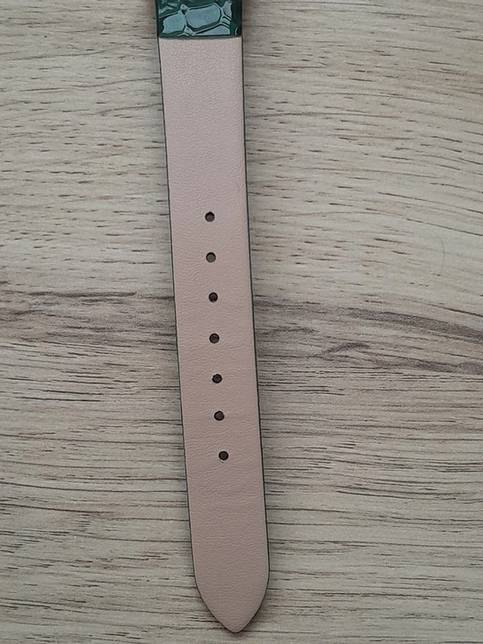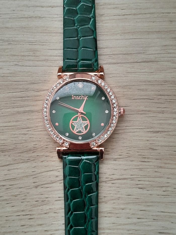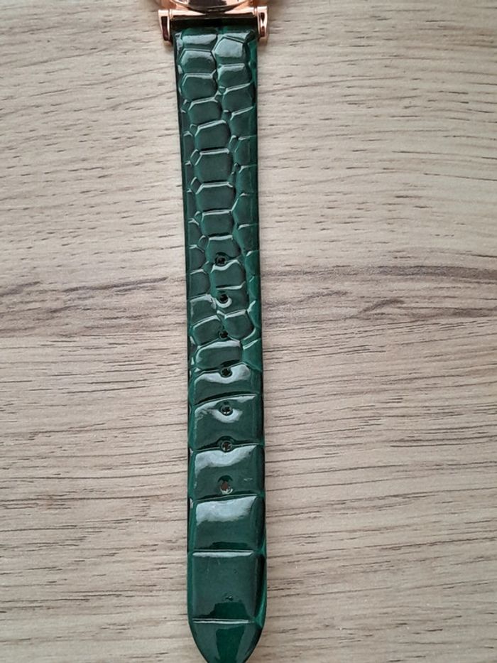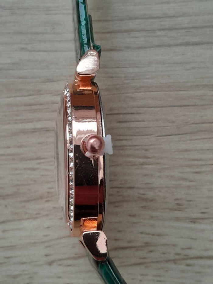 Montre femme, bracelet vert, cadran doré rose, Montre a quartz
