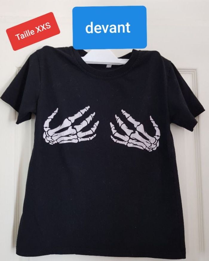 Tshirt noir, à manches courtes. Motif mains squelettiques au niveau de la poitrine (le motif est usé). Taille estimée XXS (plus d'étiquette)