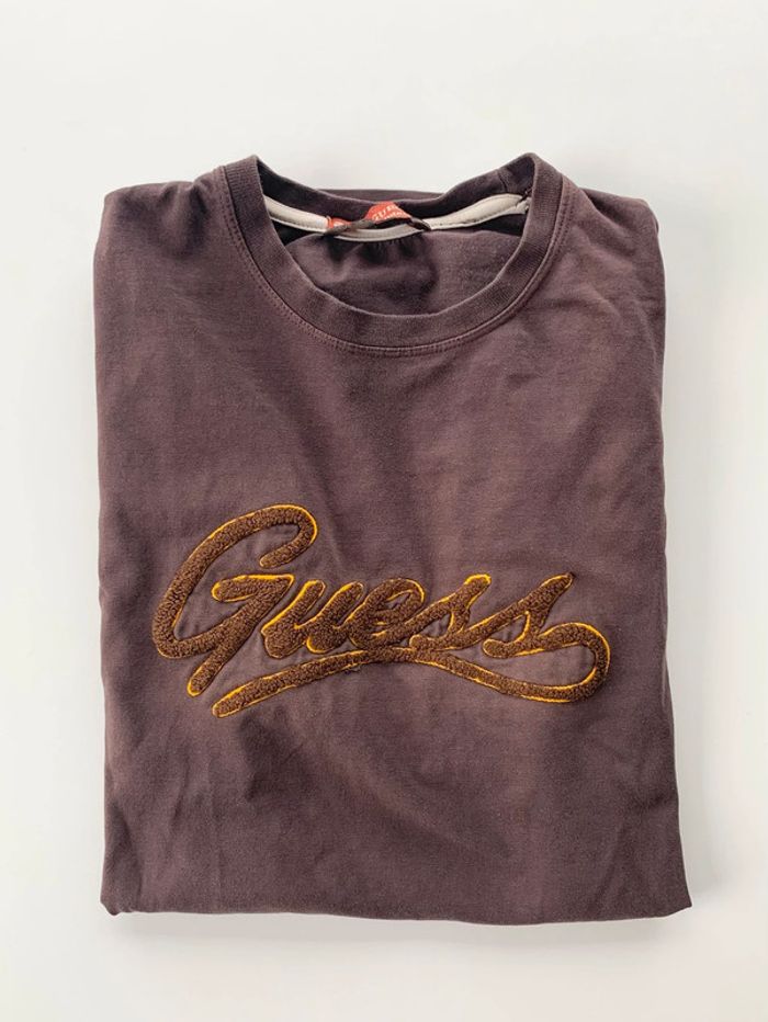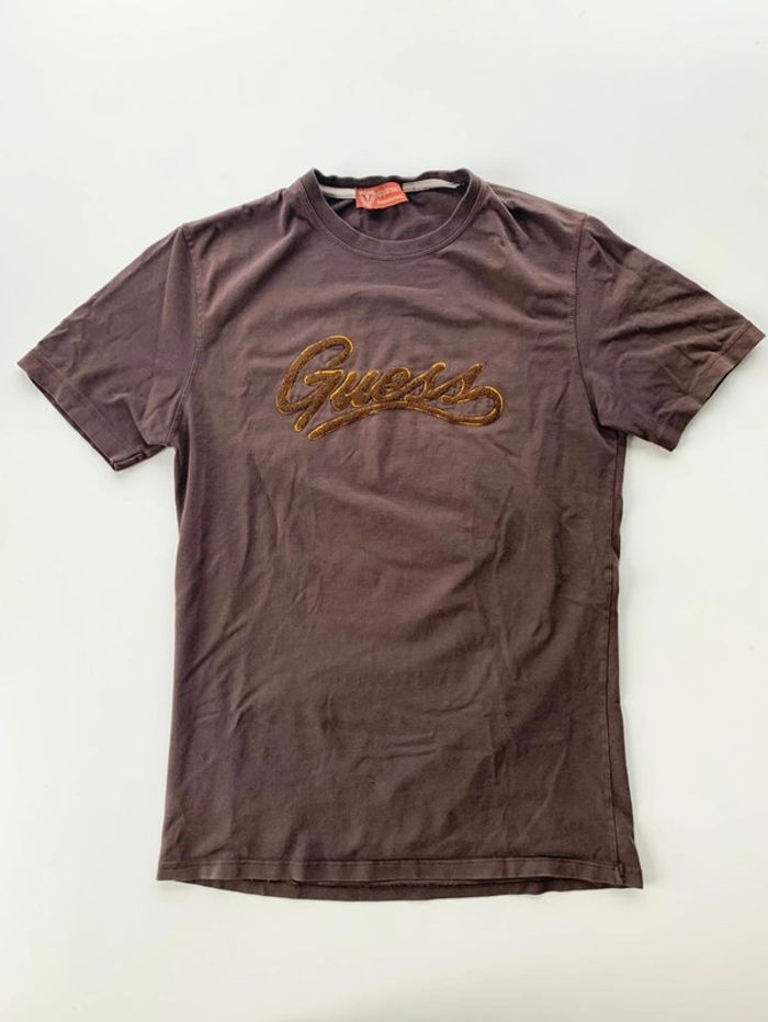 Marque : guess Couleur : marron Logo cousu en relief doux Taille : S Manches : courtes Nos vêtements sont toujours garantis sans taches, ni trou 👌🏻 Maison non fumeur, sans poils d’animaux